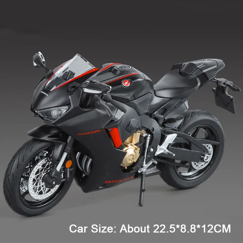 Experience the thrill of high-performance motorcycles with this highly detailed 1:9 scale model, featuring a durable metal body, plastic chassis, and rubber tires. Available in striking black, white, and vibrant blue, the model measures approximately 22.5 x 9 x 13 cm for the R1 and 22.5 x 8.8 x 12 cm for the CBR1000RR. It boasts realistic shock absorption wheels, front wheel steering, and a foldable tripod for dynamic display. Press a button to activate the lights, bringing the model to life. Batteries are included, and the craftsmanship emphasizes precision, making it an impressive addition for enthusiasts and collectors alike.