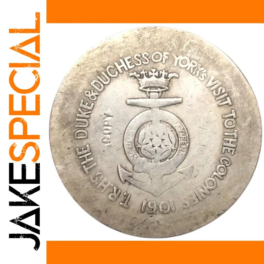 Immerse yourself in history with this beautifully crafted medallion commemorating the 1901 royal visit by the Duke and Duchess of York. Made from high-quality alloys finished to resemble silver, it features a textured, antique look that evokes a vintage charm. The intricate engravings display royal insignia, a regal crown, and a central motif of an anchor with a floating boat, surrounded by detailed star or floral patterns. The circular design is symmetrical and finely embossed, offering a tactile experience that emphasizes craftsmanship. This collectible piece celebrates a historic event with precision, making it a perfect display or thoughtful gift for history enthusiasts and royal memorabilia lovers. Own a piece of royal history today and enrich your collection.