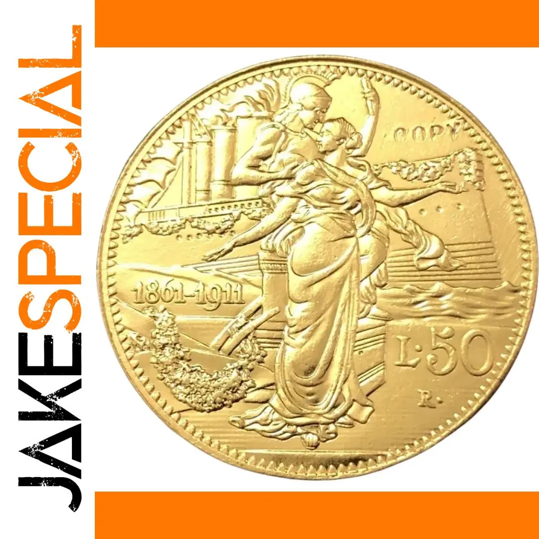 Step into history with this beautifully crafted replica of the 1911 Italian 50 Lire coin. Made from high-quality metal, it boasts a super shiny, lustrous gold finish that captures the vintage elegance of early 20th-century European currency. The coin showcases intricate, high-relief craftsmanship, with a detailed depiction of a classical female figure draped in flowing robes, holding a laurel or palm branch to symbolize victory and peace. Behind her, industrial motifs like factory smoke stacks evoke a sense of progress and modernity from the era. The coin is bordered with a beaded rim, enhancing its antique European aesthetic. Perfect for collectors or enthusiasts, this piece blends historical artistry with timeless design elements, making it a genuine eye-catcher and conversational piece.