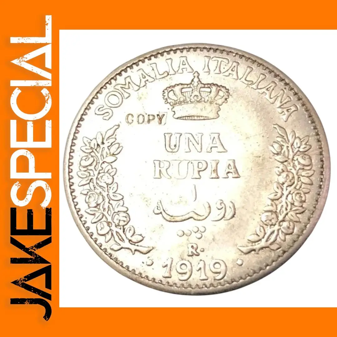 This intricately designed 1919 Somali 1 Rupia silver copy captures the elegance of the Italian Somaliland era with a vintage aesthetic. Made from high-quality metal, it features a central “UNA RUPIA” engraving, symmetrical floral motifs, and a border of evenly spaced dots, all crafted with fine detailed artistry. The silver-tone finish offers durability and a radiant shine, making it a striking addition to any collection or display. Perfect for history enthusiasts and collectors seeking a distinctive, antique-style piece, this reproduction embodies historical charm and craftsmanship, allowing you to own a beautiful glimpse into the past.