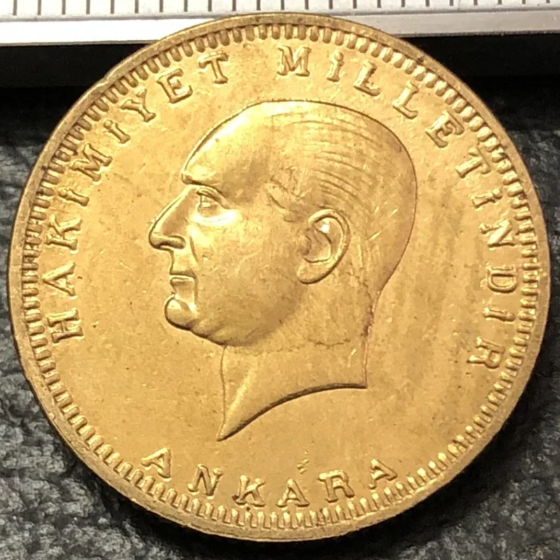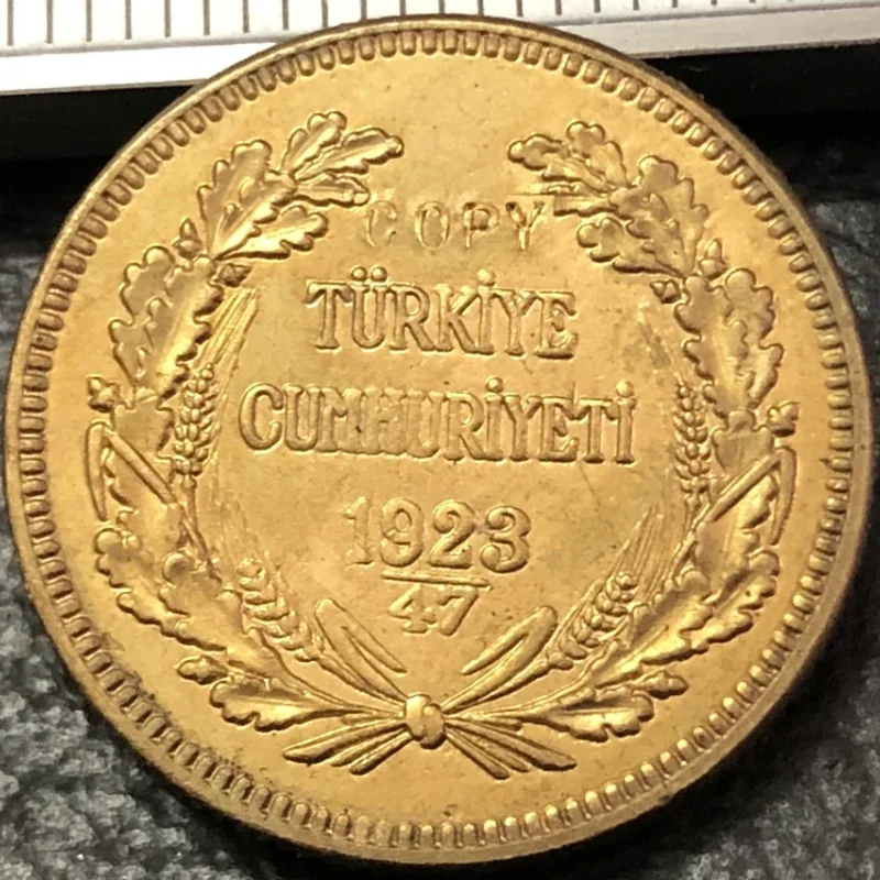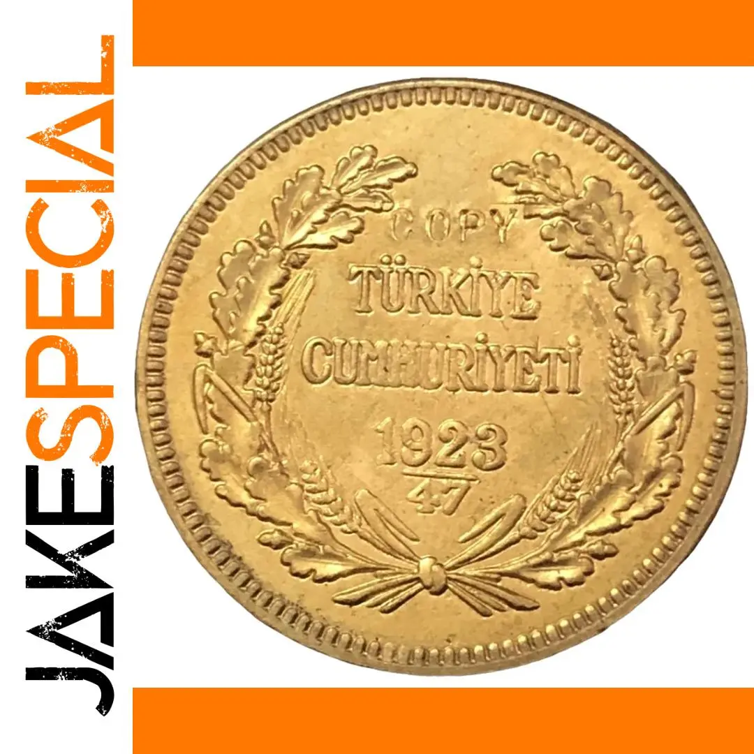 Experience the timeless charm of this replica coin inspired by the 1923 Turkey 100 Kurus Tam Cumhuriyet Altini. Crafted with meticulous detail, it features an antique-style matte finish that enhances its vintage appeal. The gold-colored metal surface highlights the intricate raised design, showcasing a prominent inscription “COPY TÜRKİYE CUMHURİYETİ 1923” at the center, surrounded by a decorative wreath of oak and laurel leaves tied with a ribbon. The textured edge with small ridges adds to its authentic, classical aesthetic. Perfect for collectors and history enthusiasts, this coin radiates a sense of heritage and craftsmanship, making it a striking decorative piece that echoes early 20th-century coinage style with modern quality.