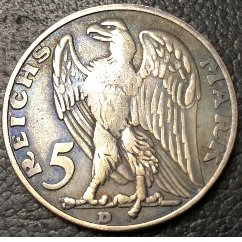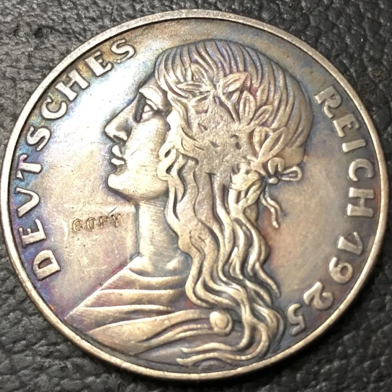- Made from durable metal with an antique-style finish, showcasing detailed embossed features of the 1925 German 5 Reichsmark coin with historic motifs.