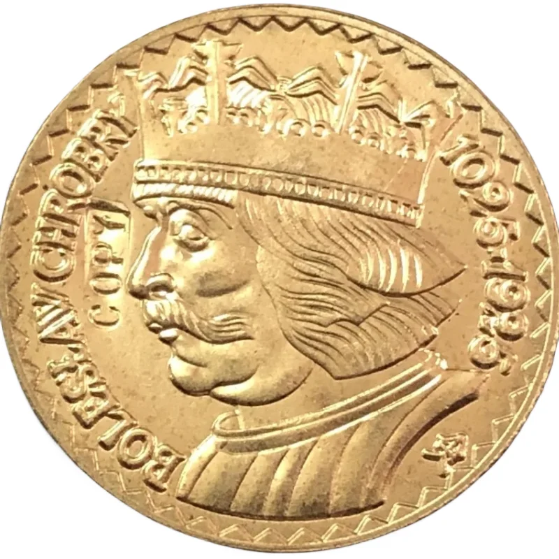 This replica coin emulates the style and appearance of the 1925 Poland 20 Zlotych featuring Boleslaw Chrobry, crafted from metal using casting techniques to achieve an authentic antique look. The circular coin measures approximately the same as the original, with a slightly raised textured edge and a smooth, metallic finish in warm golden or brass tones. The obverse showcases a detailed portrait of Boleslaw Chrobry in a classical style, surrounded by well-defined inscriptions and a patterned rim of small zigzag motifs, capturing the essence of early 20th-century European craftsmanship for display or collection.