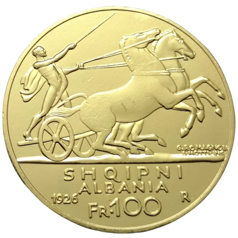- Designed with an antique European style, featuring inscriptions such as “G. ROMAGNOLI 1926,” “SHQIPNI,” and “ALBANIA,” along with the denomination “FR. 100” and a regional mintmark “R.”