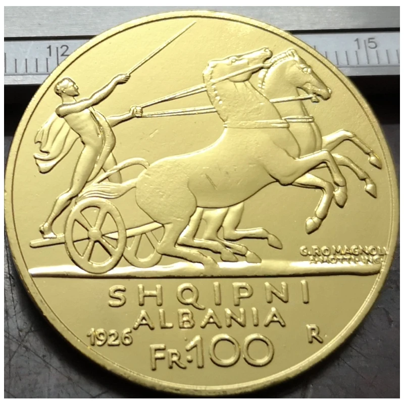 Imagine owning a beautifully detailed, antique-style coin that captures the essence of early 20th-century Albania. Crafted with a shiny gold hue, this replica coin exudes a luxurious and timeless appeal. The intricate relief design showcases a dynamic scene with a heroic figure in flowing garments riding a spirited horse, symbolizing strength and movement. The scene is detailed with precise engraving, highlighting the craftsmanship and historical significance. The coin features inscriptions including “G. ROMAGNOLI 1926,” “SHQIPNI” and “ALBANIA,” with the denomination “FR. 100,” enhancing its authenticity. Its smooth edge with a raised rim complements the overall antique aesthetic, making it a perfect collector’s piece or decorative item that echoes history’s grandeur.