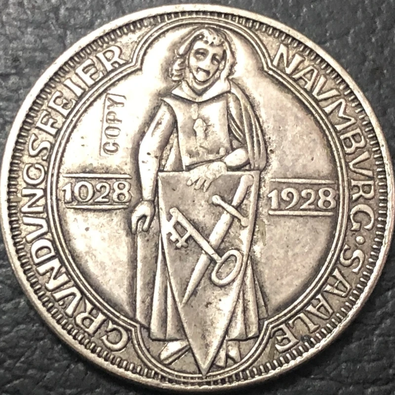 Discover this beautifully crafted replica of the 1928 Germany 3 Reichsmark Naumburg coin, designed to evoke a rich historical ambiance. Made from durable metal using casting techniques, it features an antiqued, shiny metallic finish that highlights intricate engraved details. The design showcases a smiling woman in medieval attire, holding a shield with crossed tools, symbolizing patriotism and craftsmanship. Encircled by a dotted border and engraved with inscriptions like “NAVMBVGR G.SAHNE” and the year “1928,” this coin exudes vintage elegance. Perfect for collectors, decoration, or as a historical keepsake, it's a trustworthy piece that captures the essence of early 20th-century European design, enriching your collection with its authentic aesthetic.