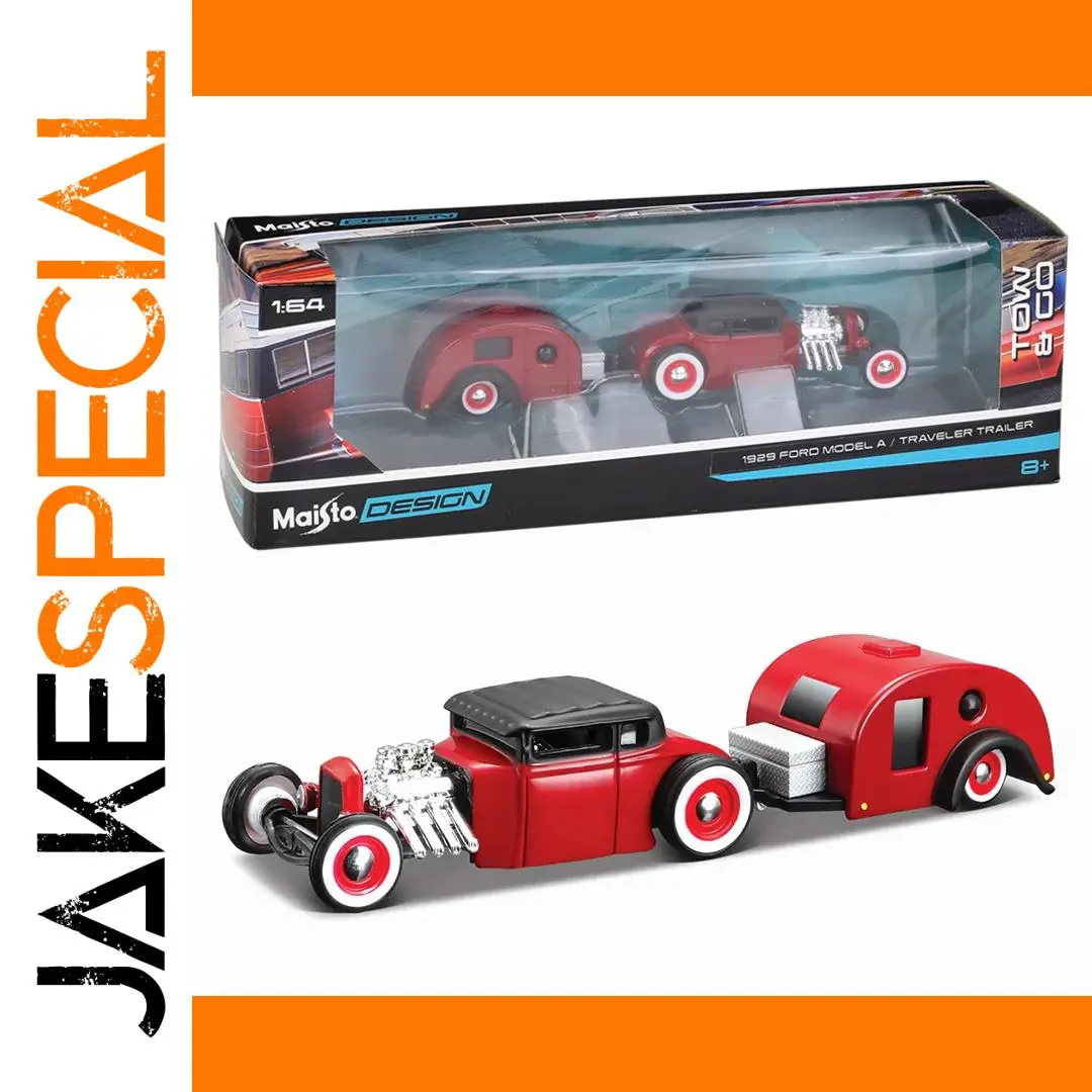 Experience the timeless charm of this highly detailed diecast model set, perfectly capturing the vintage elegance of the 1929 Ford Model A. Crafted at a precise 1:64 scale, this collectible features a striking bright red finish with a glossy surface that highlights its streamlined body and classic curves. The exposed chrome engine details add mechanical authenticity, while the white rims with red center circles evoke nostalgic style. The matching travel trailer features rounded contours, small rectangular windows with black trim, and a curved roof with a subtle vent—completing the vintage aesthetic. Made of durable metal, it’s designed for display or collection, offering a realistic impression of classic automotive design and craftsmanship for adult collectors and enthusiasts alike.