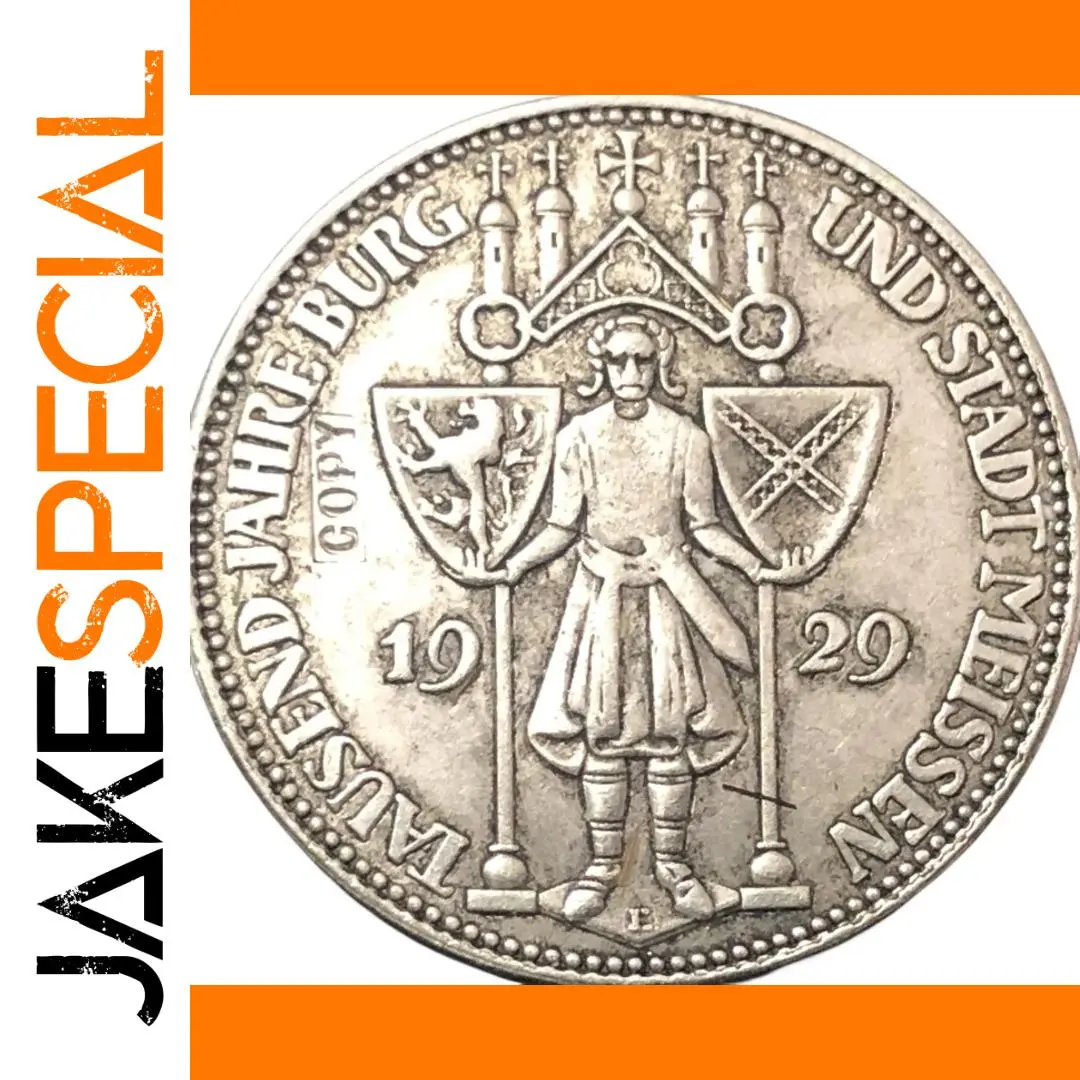 Step into history with this meticulously crafted replica coin, inspired by the 1929 German 3 Reichsmark. Made from durable metal using advanced casting techniques, it showcases an antique European style that evokes a sense of grandeur and patriotism. The coin features a striking central figure of a stern-faced man dressed in traditional historical attire, including a belted tunic, puffy trousers, and boots, with exceptional relief work that adds depth and realism. Above him, decorative architectural elements symbolize a historic monument with domes and crosses, enhancing its regal appeal. The border contains intricate inscriptions, including “DEUTSCHES REICH,” “GOTT MIT UNS,” and the year “1929,” along with heraldic shields. Perfect for collectors and history enthusiasts alike, this piece offers a unique glimpse into early 20th-century European heritage.