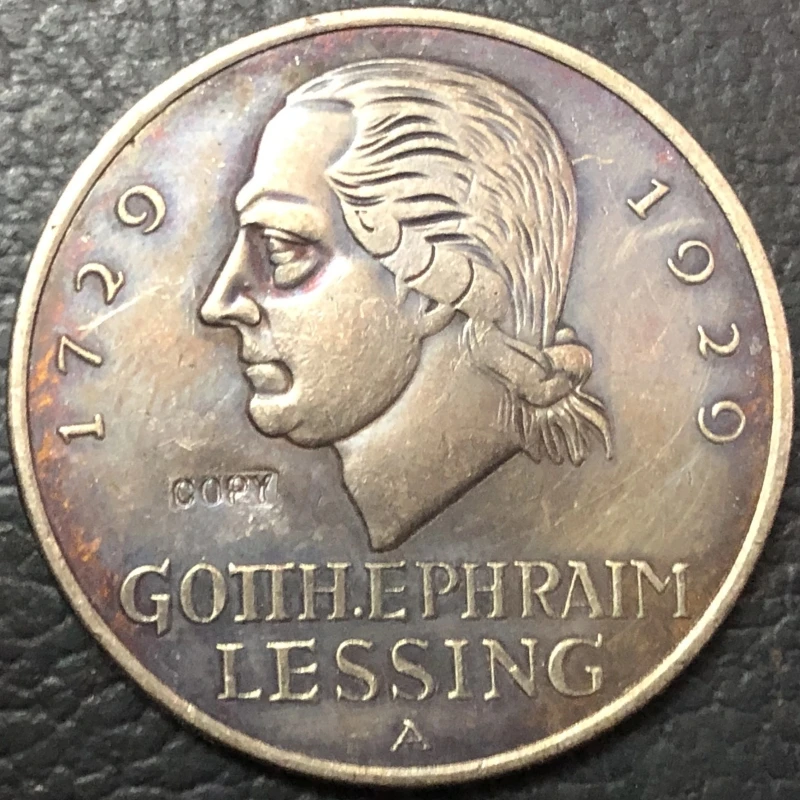 Enhance your collection with this finely cast replica of the 1929 German 5 Reichsmark coin, crafted from metal with an antique European style using casting techniques. Featuring a detailed profile of a woman facing left, with intricately styled wavy hair tied in a low bun, the coin exudes a dignified, vintage appearance. The design includes engraved dates “1927” and “1929” along the upper border, with the inscription “GOTTH. EPHRAIM LESSING” at the bottom and a small mint mark “A” beneath. With a dull silver or pewter hue, smooth edges, and precise craftsmanship, this patriotic-themed reproduction offers a timeless, collectible aesthetic perfect for history enthusiasts.