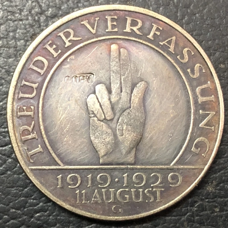 Step into history with this exquisite replica of the 1929 Germany 5 Reichsmark coin. Crafted with casting techniques from durable metal, this coin captures the vintage European aesthetic perfectly. The antique silver-pewter finish gives it an aged, historical look, while the smooth, polished rim contrasts with the textured relief of the central design and inscriptions. The central motif features a hand gesture resembling a peace sign, embossed in relief, emphasizing a patriotic theme from the early 20th century. Surrounding inscriptions in bold uppercase letters further evoke the coin’s historical essence, complemented by dated details “1919-1929” and the mint mark “G.” Ideal for collectors, enthusiasts, or as decorative display, this replica beautifully embodies the patriotic spirit of its era.