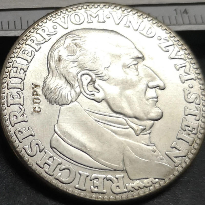 Step into history with this beautifully crafted replica coin modeled after a 1931 German coin. Crafted with meticulous detail, this silver-plated reproduction captures the essence of European antique style from the early 20th century. The coin features an intricately cast relief of a prominent profile portrait, showcasing finely carved facial features, layered wavy hair, and a high-collared uniform that reflects historical military or formal attire. The circular design is enhanced by an elegant beaded border and Latin inscriptions, giving it a timeless, refined appearance. Its authentic antique look exhibits a slightly aged surface, rich metallic sheen, and delicate craftsmanship. Perfect for collectors, this coin adds vintage charm and historical depth to your collection or display.