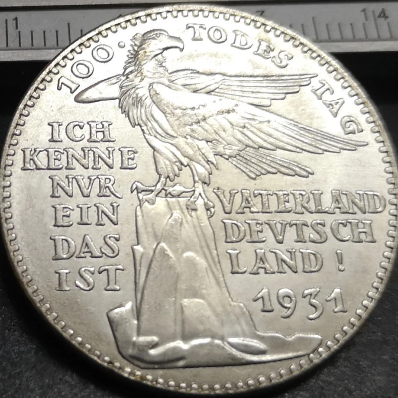 - Represents a detailed 1931 German coin model, emphasizing vintage European craftsmanship with a silver-like metallic finish and antique-inspired design elements.