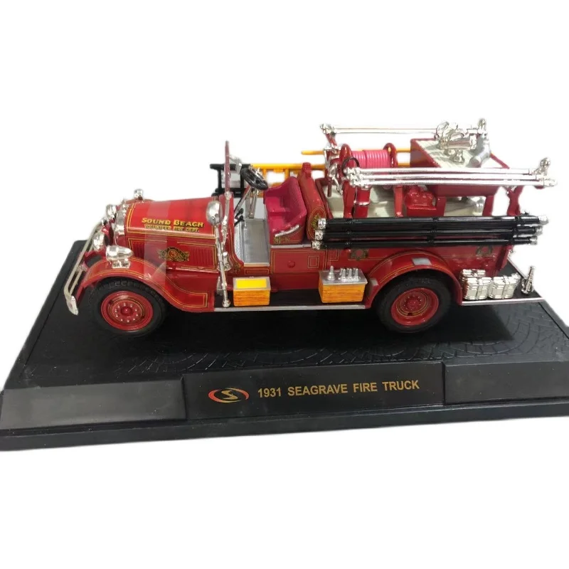 Experience the charm of early 20th-century firefighting with this meticulously crafted diecast model of a 1931 American Seagrave fire truck. Measuring approximately 15 centimeters in length, this static display piece brings vintage firefighting history to your collection. The vibrant red finish is complemented by chrome accents around the grille, headlights, and bumper, evoking a nostalgic, classic appeal. Intricate painted lines and molded details, like panel lines and decorative trims, enhance authenticity. Features such as red wheels with detailed hubcaps, textured tires, yellow reflective markers, and functional firefighting equipment—including hose reels, ladders, and metallic cylinders—completely capture the essence of a vintage fire truck. This model is perfect for adult collectors seeking a high-quality, visually striking display item.