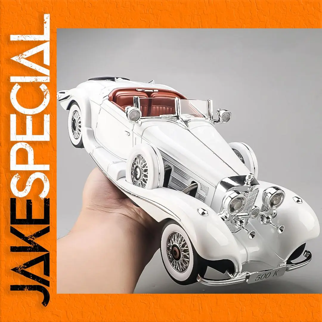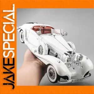 The 1:18 scale diecast model of the 1936 Benz 500K captures vintage elegance with a metal body measuring approximately 10 cm in length. Featuring a sleek, rounded aerodynamic design, it is finished in pristine white, highlighting its luxurious aesthetic, or available in black and silver. The detailed exterior includes chrome bezels around round headlamps, a finely etched grille, chrome side mirrors, and spoked wheels with chrome accents, complemented by black tires with detailed treads. Designed as a large desktop decoration or collectible, this high-quality model requires no electrical components or chemicals, making it an ideal gift for adult enthusiasts seeking timeless automotive craftsmanship.