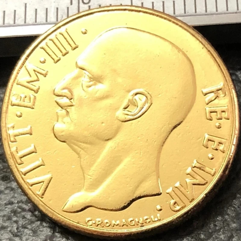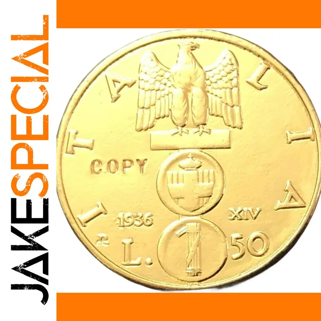 This replica of the 1936 Italian 50 Lire gold coin captures the antique European style with rich, gold-toned metal and intricate raised relief details. Featuring a majestic eagle with outstretched wings perched atop a rectangular base, a central emblem with a shield and stylized symbols, surrounded by finely engraved Roman numerals and characters, and bordered by a textured rim, this coin exudes a classic, ornate aesthetic. Crafted through casting techniques, it offers a polished, reflective surface that mimics the grandeur of historical currency. Perfect for collectors and enthusiasts, this imitation coin provides an authentic look and feel, bringing a piece of history into your collection.