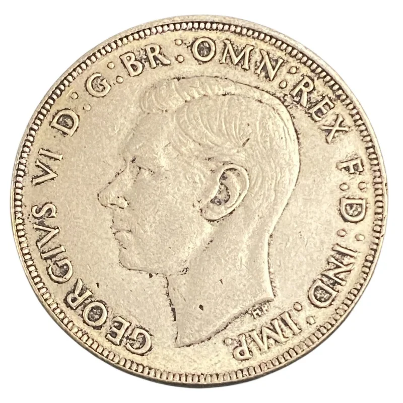- Obverse side displays a detailed portrait of King George VI facing left with a beaded border and uppercase inscription, reflecting the original coin design.