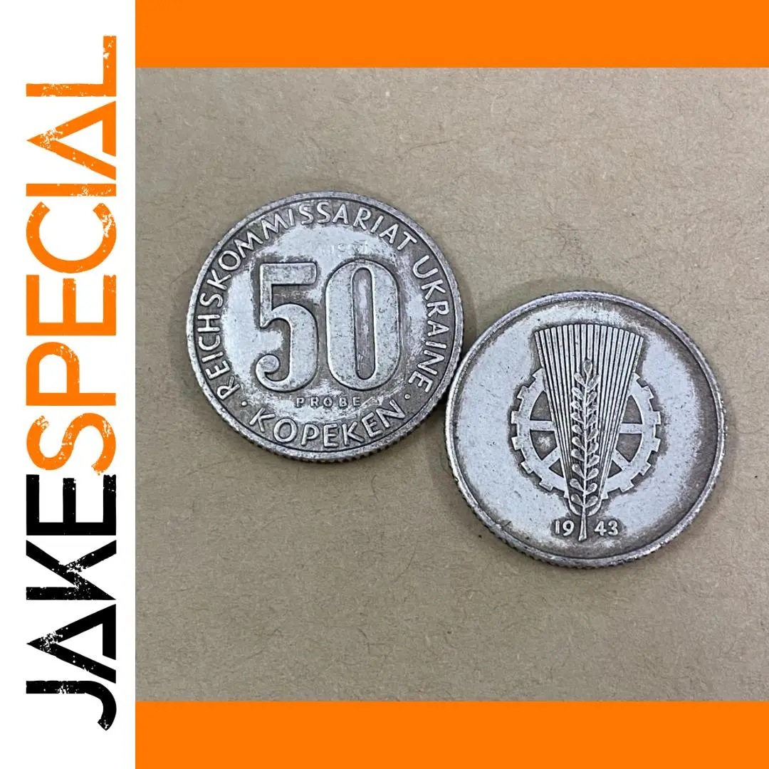 Imagine owning a piece of history with this beautifully crafted replica of the 1943 Ukraine 50 Kopeks from the Reichskommissariat Ukraine. Made from copper using casting techniques, this coin captures the vintage charm of wartime Europe. Its rich, aged patina and textured surface evoke an authentic antique appearance, perfect for collectors or enthusiasts of nostalgic and historical memorabilia. The front displays a bold “50” denomination with detailed inscriptions emphasizing its historical design, while the reverse features a stylized wheat stalk intertwined with a gear wheel, symbolizing agricultural and industrial themes of the era. With reeded edges and a beaded border, this coin blends detailed craftsmanship with rustic vintage appeal.