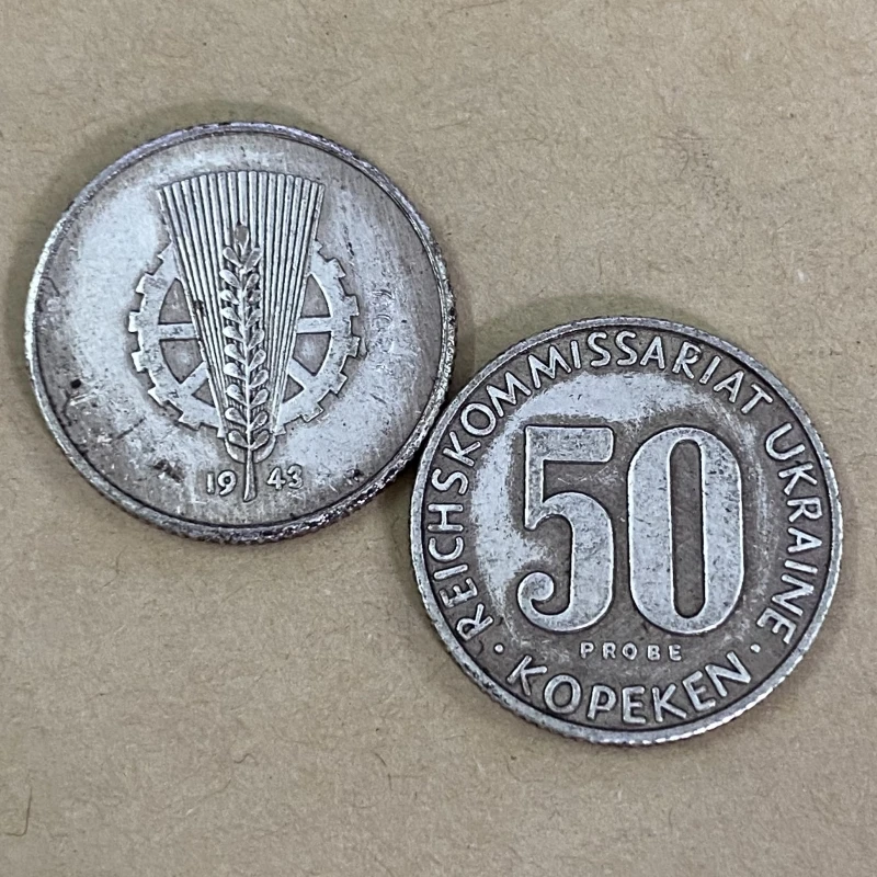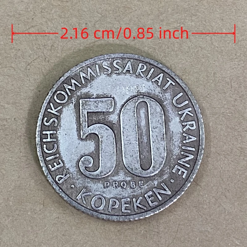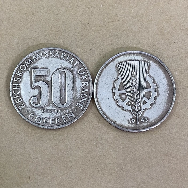 - Design includes a prominent “50” denomination on the obverse, surrounded by inscriptions “REICHSKOMMISSARIAT UKRAINE” and “KÖPEKEN” with reeded edges and a beaded border.
