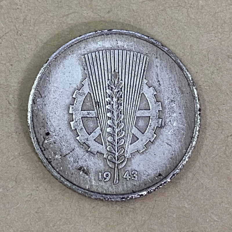 - Reverse presents a stylized wheat stalk within a gear wheel, symbolizing agriculture and industry, with the year “1943” engraved below for period accuracy.