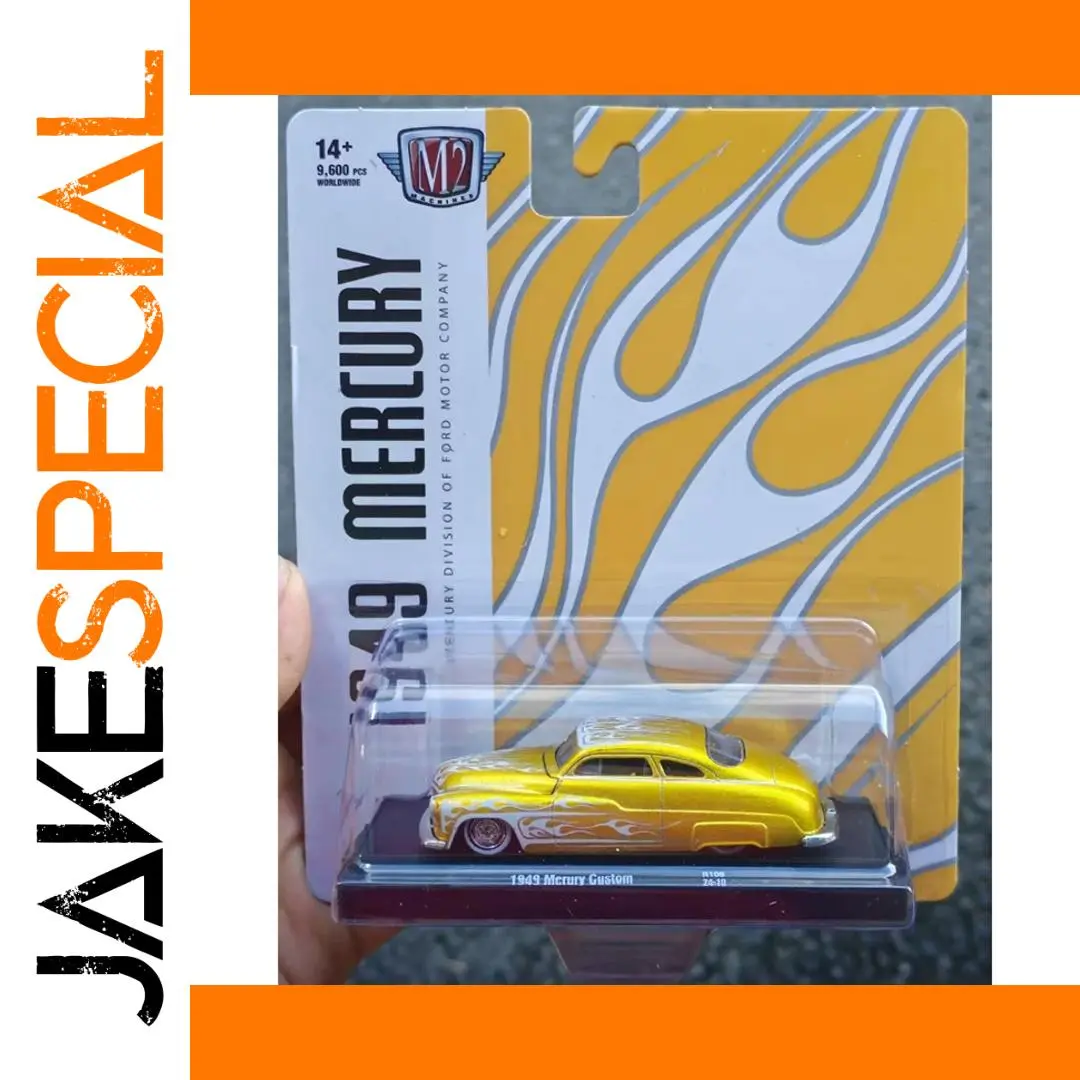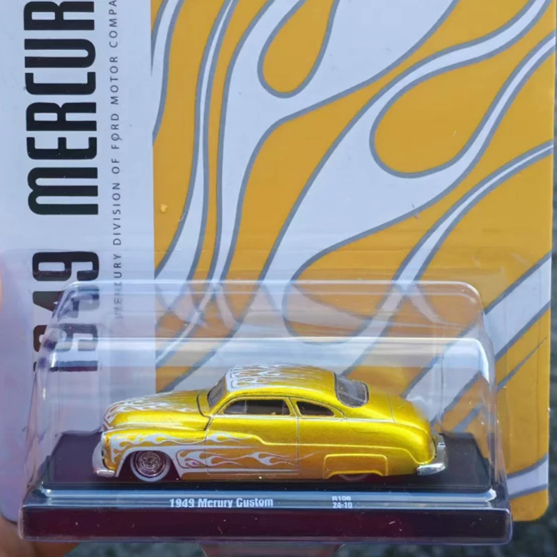 Imagine showcasing this stunning 1:64 scale diecast replica of the classic 1949 Mercury Custom in your collection. Its vivid metallic yellow or gold finish immediately catches the eye, reflecting light beautifully for a highly realistic appearance. The flame decals in striking shades of orange and yellow add a bold, vintage flair, emphasizing its period-accurate styling. The rounded, streamlined body showcases the elegant curves and smooth lines characteristic of late 1940s automobiles. Small, detailed windows with black trim increase its authenticity, while the chrome-rimmed black tires provide a realistic touch. Perfect as a display piece, this highly detailed model evokes nostalgia and style, bringing a vintage automotive icon into your personal collection with unforgettable vibrancy and fine craftsmanship.