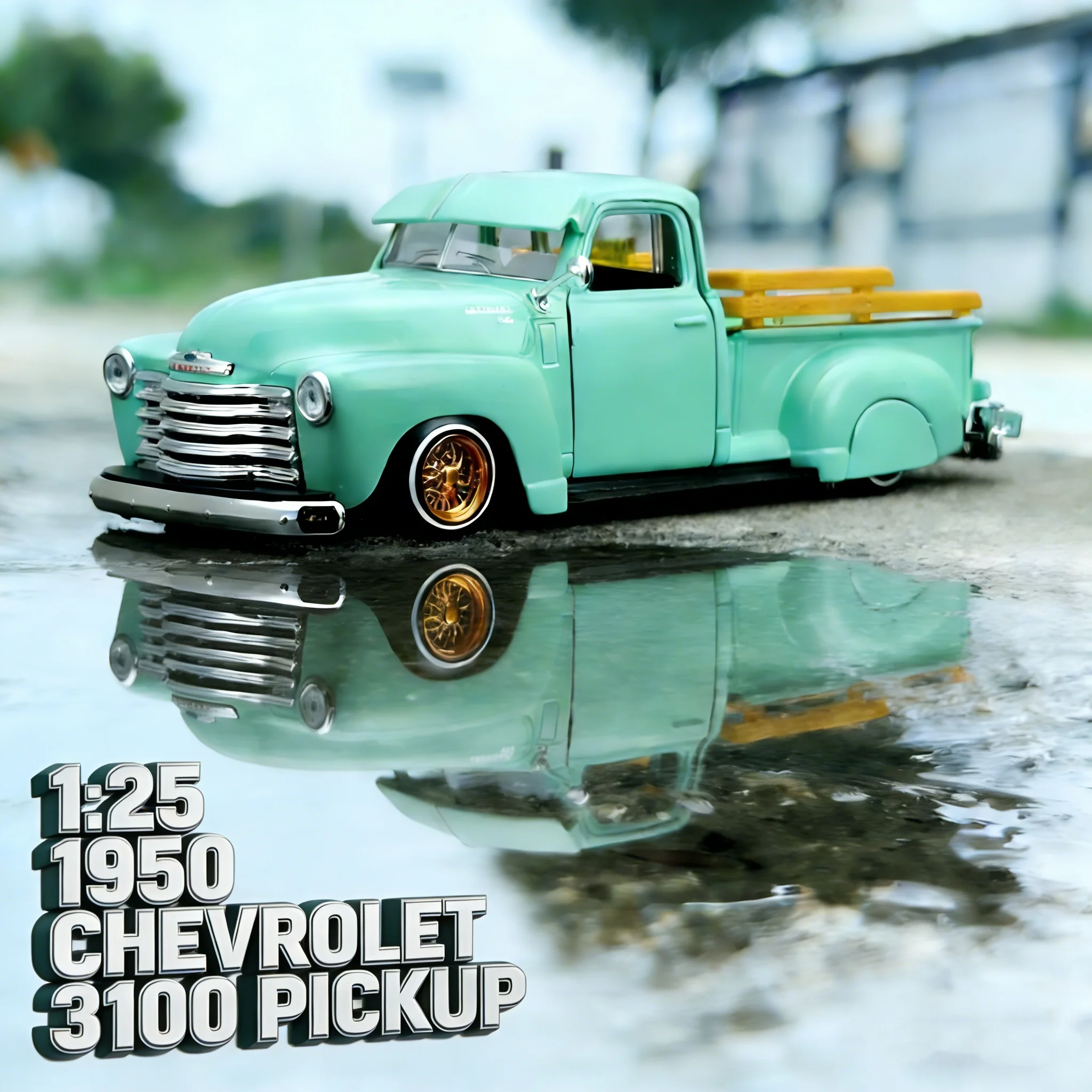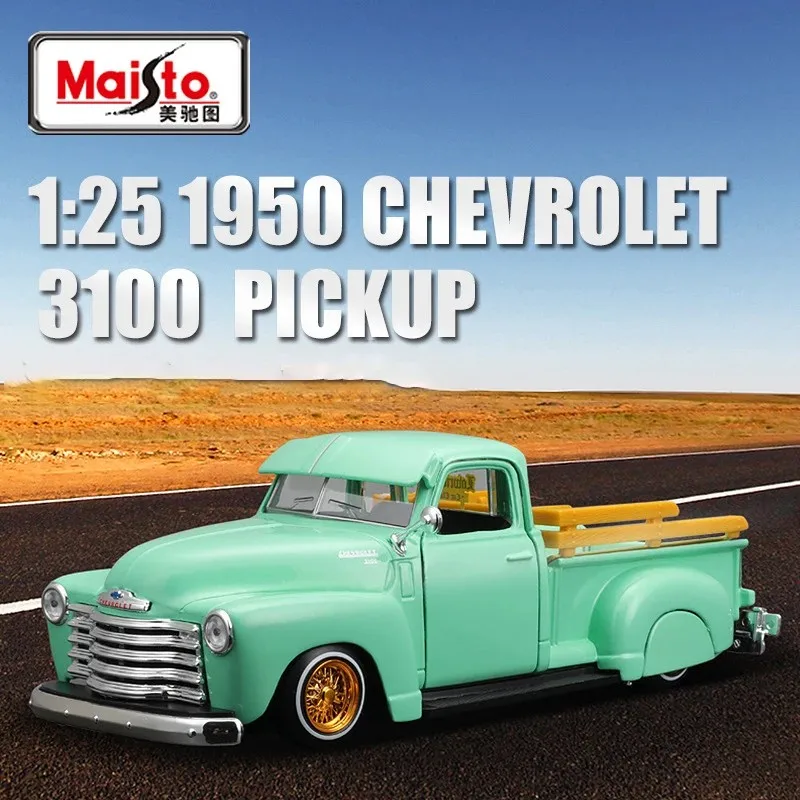 Experience vintage charm with this 1:25 scale diecast model of a 1950 Chevrolet 3100 Pickup. Crafted from alloy and plastic, this detailed replica features a vibrant blue body, chrome grille with horizontal slats, round headlights with chrome accents, and a natural wood-finish open bed with light brown planks. The black rubber tires with intricate tread patterns are mounted on gold multi-spoke rims, adding realism and elegance. Perfect for display or collection, this non-electric model is suitable for ages 4 and above, adhering to strict certification standards for quality and safety. Capture the timeless appeal of this classic truck in perfect miniature detail.