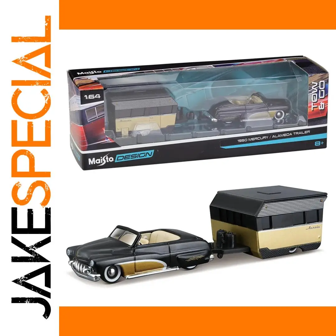 Experience the timeless charm of this meticulously crafted diecast metal model of a 1950 Mercury Alameda paired with a vintage flatbed tow truck trailer. Built to a 1:64 scale, this collectible piece captures the sleek, retro aesthetic of the 1950s, showcasing its rounded, elongated body finished in glossy black with elegant gold accents that highlight its stylized fins and trim. The front features realistic, rounded headlights integrated into classic fenders, complemented by a shiny chrome grille. The clear, slightly curved windshield reveals a detailed beige interior, complete with molded seats and dashboard. The attached trailer echoes the car’s sophisticated color scheme and vintage charm, with textured horizontal lines and the “Alameda” script on the front. Perfectly detailed wheels with silver hubs connect the nostalgic look with impressive realism, making it an ideal addition for collectors and enthusiasts alike.