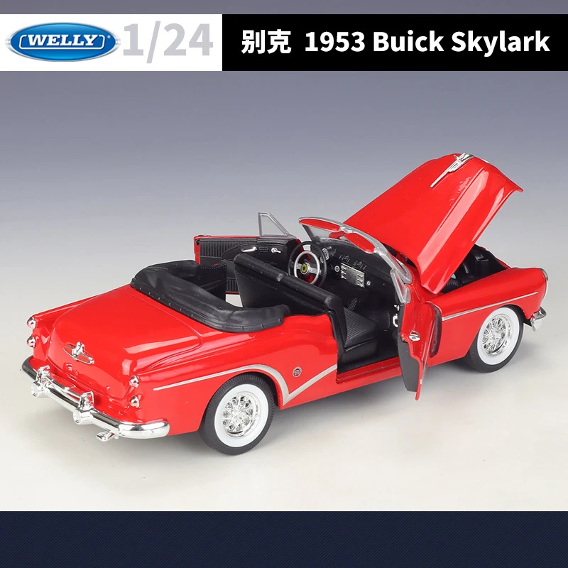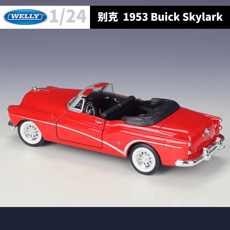 Experience nostalgia with this vibrant red WELLY 1953 Buick Skylark diecast model. Crafted with alloy and plastic, this 1:24 scale collectible captures the sleek, rounded design of classic 1950s automobiles. The glossy red finish makes it visually striking, complemented by chrome accents including the grille, hubcaps, and subtle trim lines. The convertible soft top in black contrasts beautifully with the body, adding authentic period detail. The front features a vertical chrome-bar grille flanked by large round headlights and fog lights, all meticulously crafted for realism. With small chrome door handles, a hood ornament, and realistic panel lines, this miniature embodies vintage elegance, perfect for display or imaginative play. It’s a treasure for car enthusiasts and collectors alike.