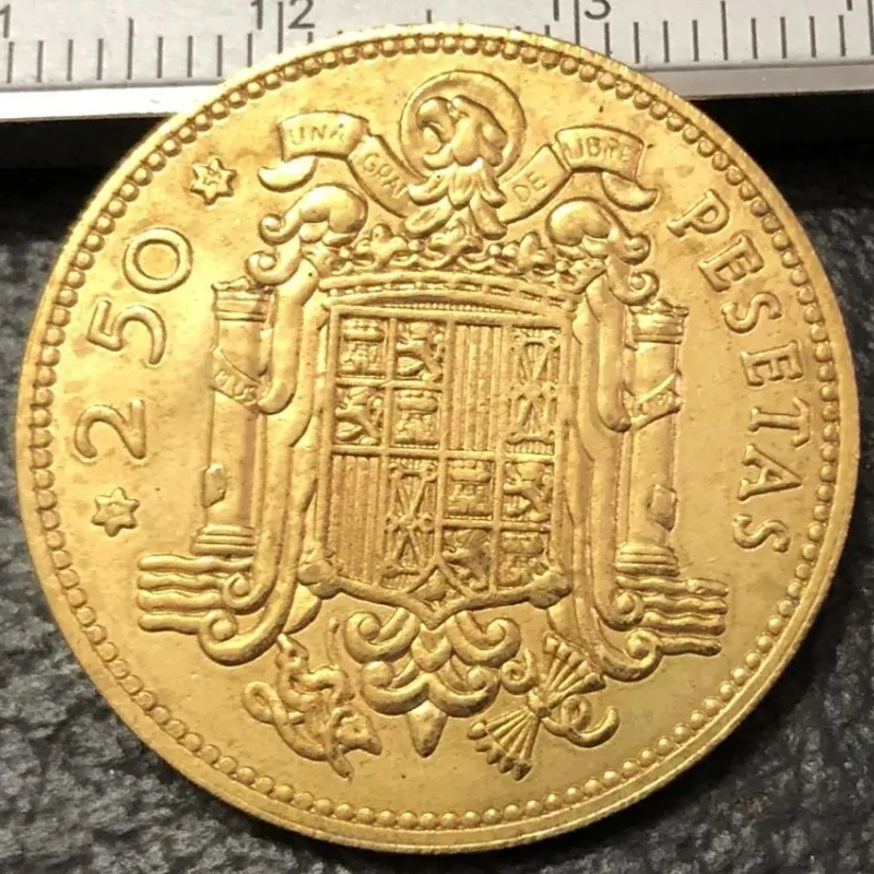 Experience the vintage charm of this 1953 Franco bronze replica coin, showcasing intricate embossed details including the heraldic shield, regal crown, and ornate pillars with scrollwork. Crafted with casting techniques from durable metal, it features a rich, golden-brown bronze finish that lends an antique appearance. The coin’s round shape is accentuated by a beaded border, highlighting its decorative elegance. Designed to resemble a historical artifact from 1940-1959, this replica combines classical heraldic motifs with finely textured reliefs, making it a distinguished addition to any collection or display of European numismatic history.