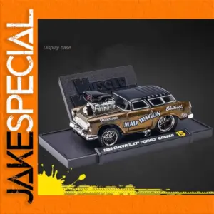 Step into the world of classic muscle cars with this stunning 1955 Chevrolet Nomad Gasser diecast model. With its rich metallic brown and black color scheme, this detailed model captures the spirit of vintage automobiles. The gleaming finish not only adds an aesthetic appeal but also makes the intricate details pop, such as the prominent blower scoop and chrome accents. Complemented by an embossed black display base, this collectible piece is perfect for enthusiasts and collectors alike. With the iconic “MAD WAGON” lettering and recognized branding from “Edelbrock” and “Firestone,” it represents the golden age of racing. Bring the nostalgia and thrill of classic car culture right into your collection.