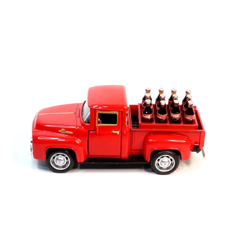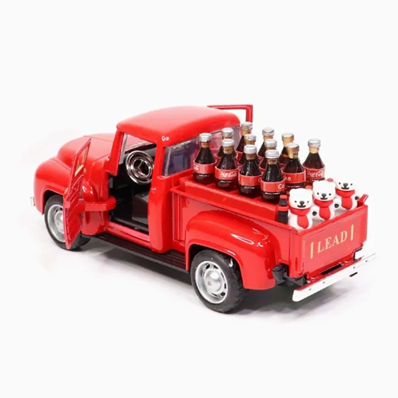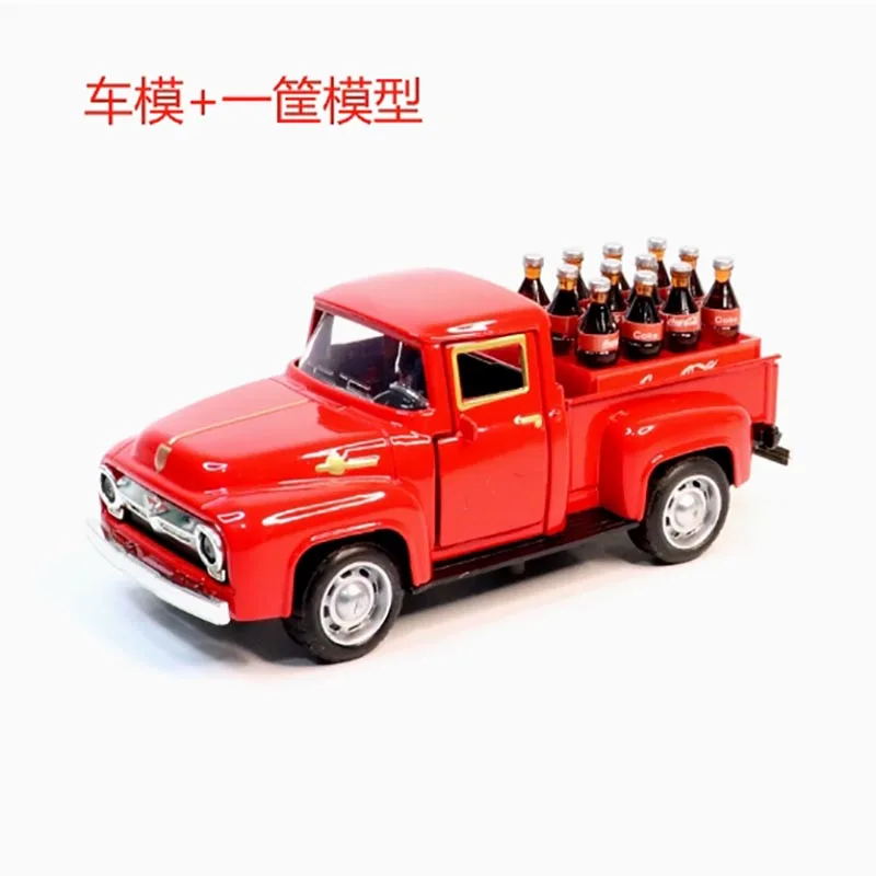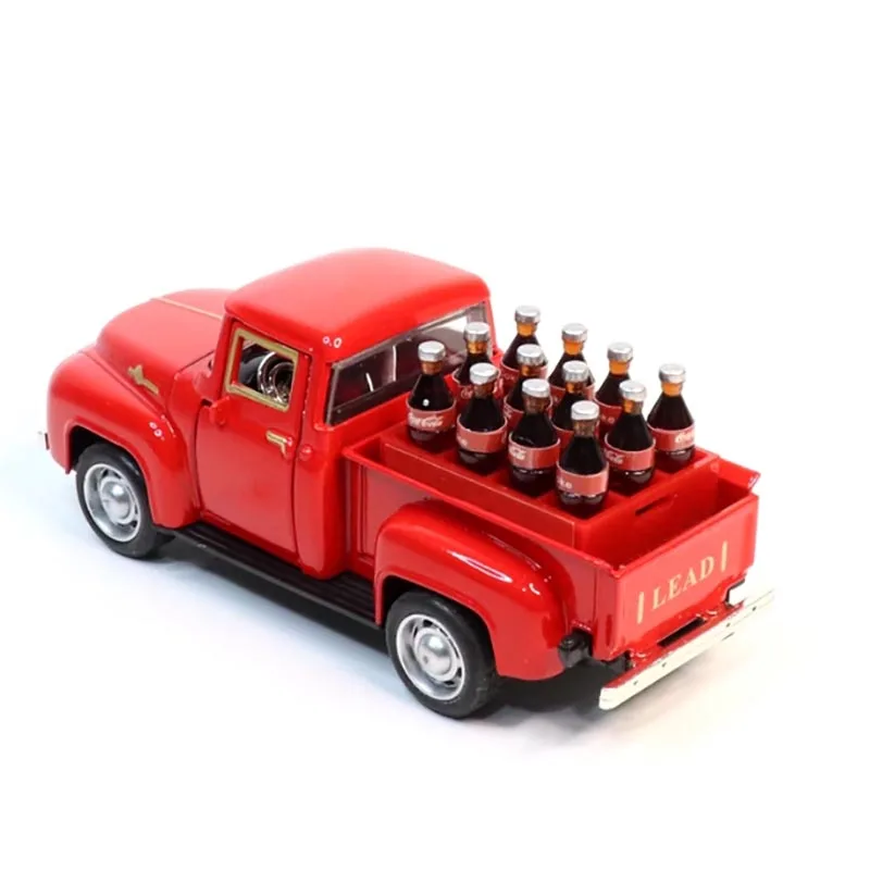 This stunning 1:32 scale model of a 1955 pickup truck transporter boasts a vibrant red finish, measuring approximately 12.5 cm in length, 5 cm in width, and 4 cm in height. Crafted from high-quality alloy and plastic, it showcases intricate detailing, including a chrome grille, round headlights, and a thin gold stripe accentuating the hood. The smooth sides feature functional doors revealing a well-detailed interior with a steering wheel and dashboard. Accompanied by baskets and bottles measuring 40mm x 31mm x 24mm, with each bottle at 23mm x 6mm, this model is perfect for collectors and adds a touch of vintage charm to any display.