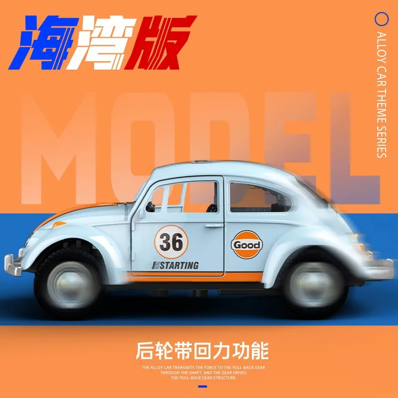 Experience a nostalgic journey with this stunning 1:36 scale diecast model of the classic 1955 Volkswagen Beetle, inspired by retro Gulf racing aesthetics. Crafted from durable metal, it features vivid color schemes like light blue with orange racing stripes or bright orange with blue accents, each meticulously detailed to showcase the rounded contours and vintage charm of the original design. The model includes authentic racing decals, a white circular logo on the roof, and realistic headlight and bumper details. Its pull-back mechanism provides smooth movement, making it perfect for collectors and enthusiasts aged 14 and above. Presented with multiple box options, this replica offers both display appeal and interactive fun in a compact, sturdy form.