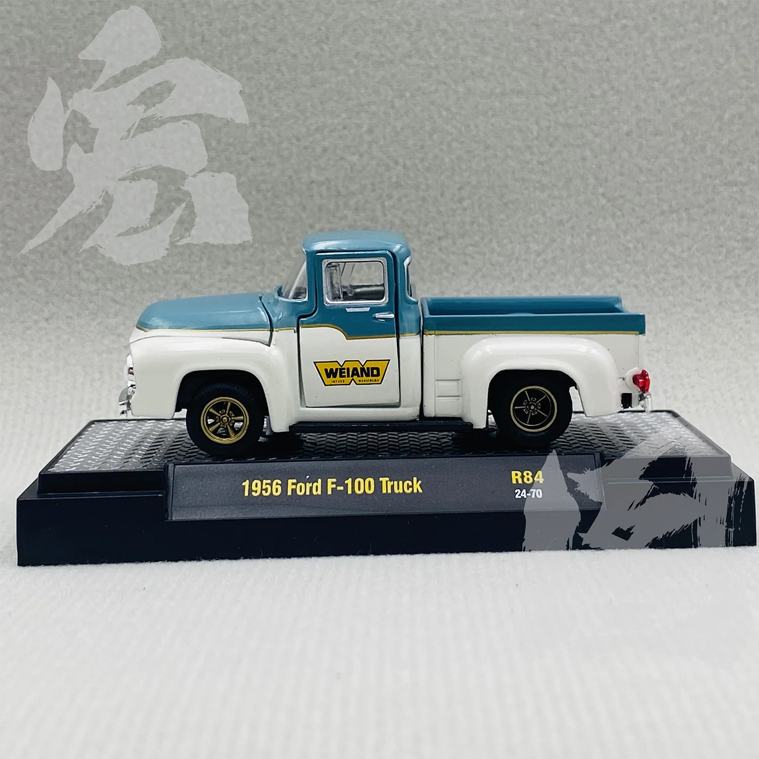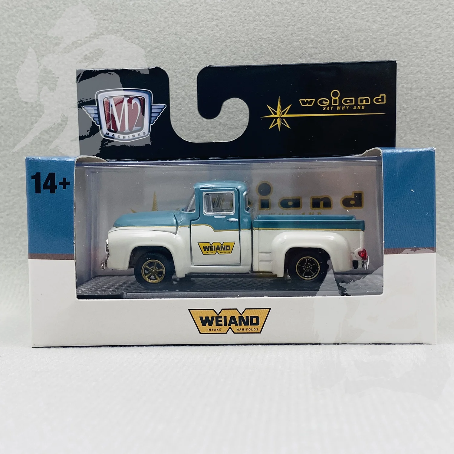- The truck features a classic two-tone paint job with a light blue upper section and off-white lower body, enhanced by silver details and realistic decals like “WEIAND”.