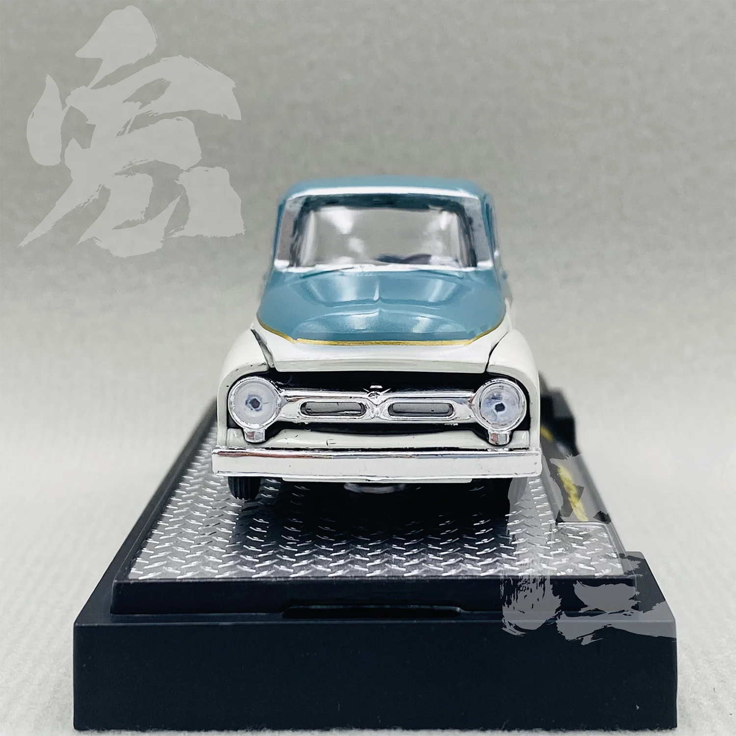 Imagine owning a beautifully crafted 1:64 scale die-cast replica of the iconic 1956 Ford F-100 transport truck. This model captures the vintage essence with its realistic two-tone color scheme of light blue and off-white, complemented by metallic gold accents on the wheels. The detailed silver grille, headlights, and side mirrors add to its authentic appearance. Perfect for static display, it provides a nostalgic touch to any collection or office decor. The high-quality alloy and ABS plastic construction ensures durability and precision. Whether you're a collector or a fan of classic vehicles, this meticulously designed model allows you to enjoy a piece of automotive history every day.
