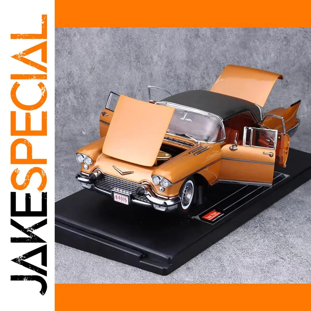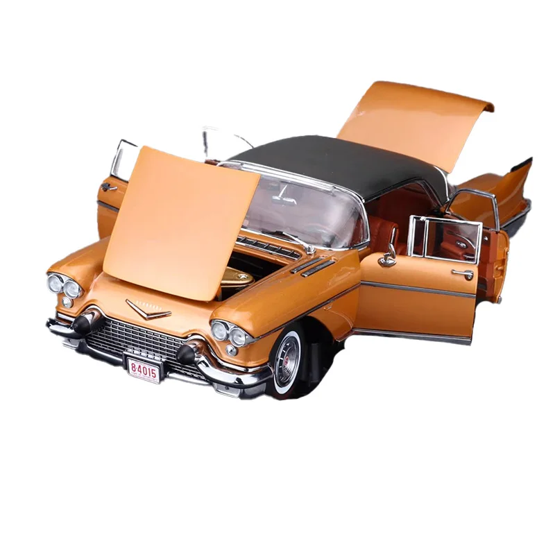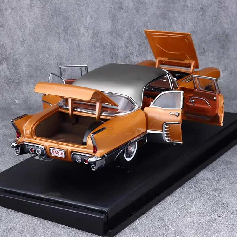 Experience the timeless elegance of this highly detailed 1:18 scale alloy model of the 1957 Cadillac El Dorado, masterfully crafted by Sun Star. The vibrant metallic orange finish with a glossy surface captures the vintage charm and iconic design of the 1950s. Its classic features include bold front and rear fins, a sleek streamlined body, chrome accents, and a contrasting black roof that enhances its nostalgic appeal. The detailed engine bay, open doors revealing a sophisticated interior, chrome hubcaps, and white-wall tires reflect superb craftsmanship. Perfect for collectors, this model brings the glamour and elegance of a vintage Cadillac right into your display, elevating your collection with authentic detailing and beauty.