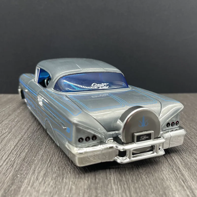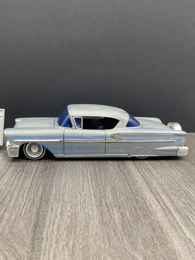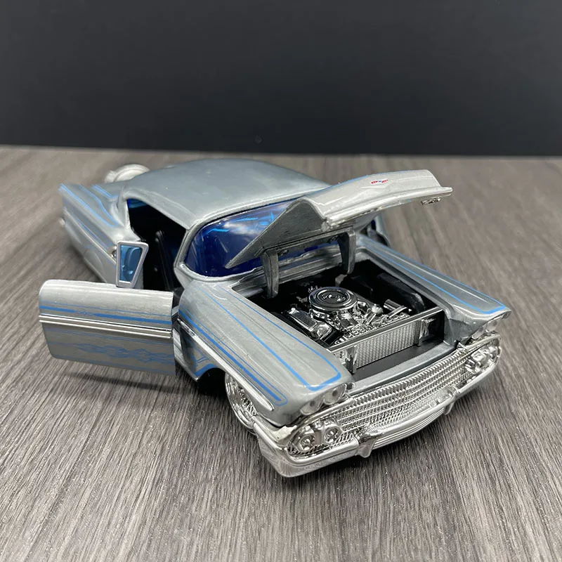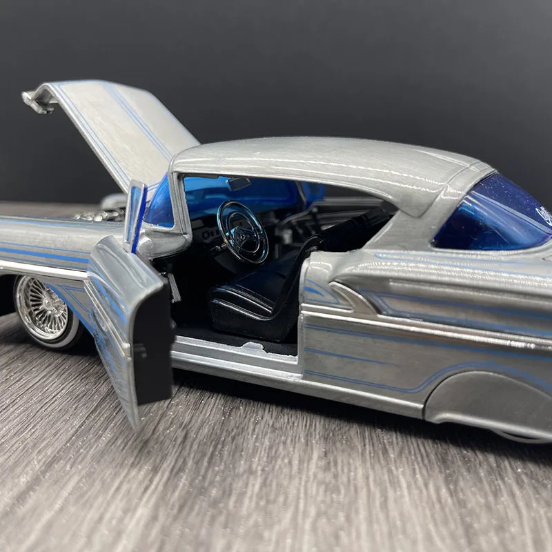 This stunning 1:24 scale diecast model of a 1958 Chevrolet Impala is an exquisite collectible that showcases classic automobile style. With a shiny silver exterior complemented by intricate blue pinstriping, this model embodies the sleek curves and lines typical of the late 1950s automobiles. It features openable left and right doors, as well as front and rear hoods, enhancing its realistic charm. Measuring approximately 22 cm in length, 8 cm in width, and 7 cm in height, this high-quality blend of alloy and plastic makes it perfect for display or gifting, captivating car enthusiasts with its eye-catching details.