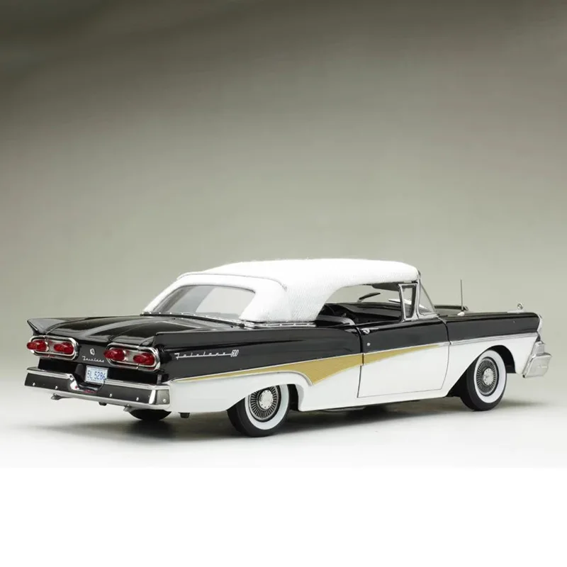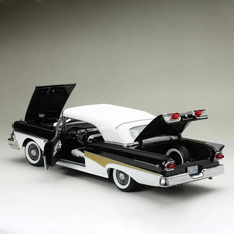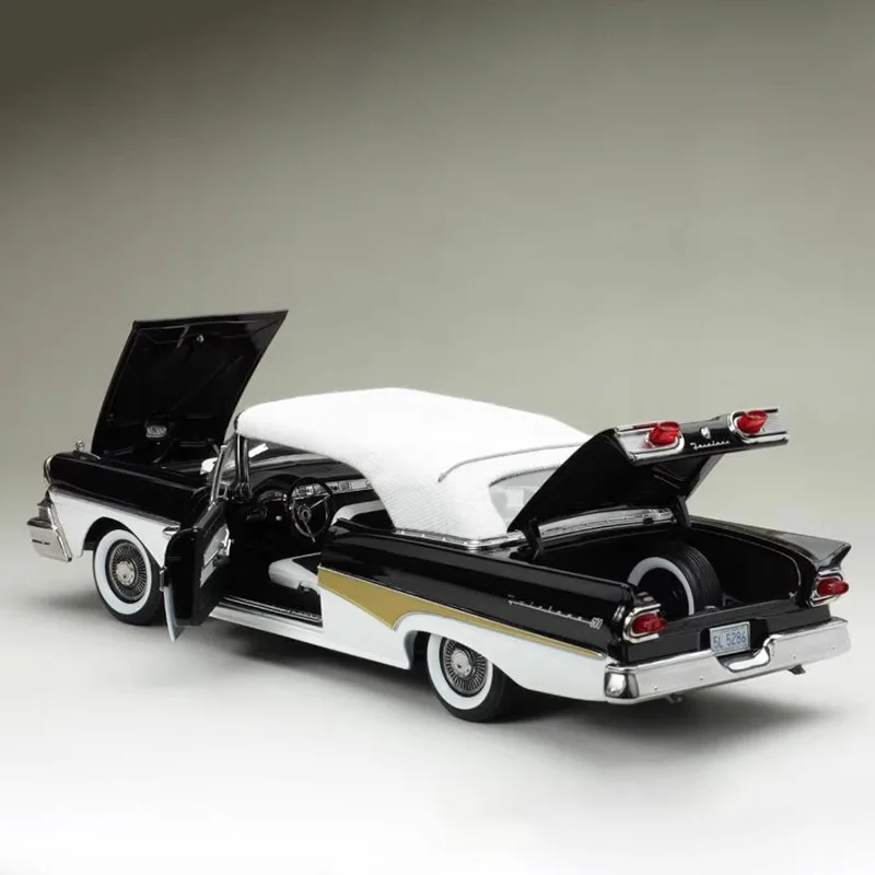 Step into nostalgia with this exquisitely crafted 1:18 scale diecast model of the 1958 Ford Fairlane 500. Its alloy main body, finished with a glossy lacquer coating, perfectly captures the vintage elegance and sleek elongated silhouette of the era. The two-tone color scheme features a classic black body accented with white on the roof, side panels, and rear fins, enhancing its authentic appeal. Functional rubber tires with white sidewalls rest on detailed alloy rims, while subtle gold-colored accents add a touch of luxury. Open the hood and trunk to reveal the detailed compartments that mimic the real car’s layout. This collectible serves as a timeless piece for display, radiating craftsmanship and nostalgic beauty in your collection.