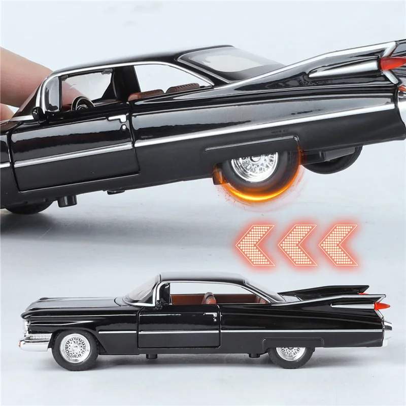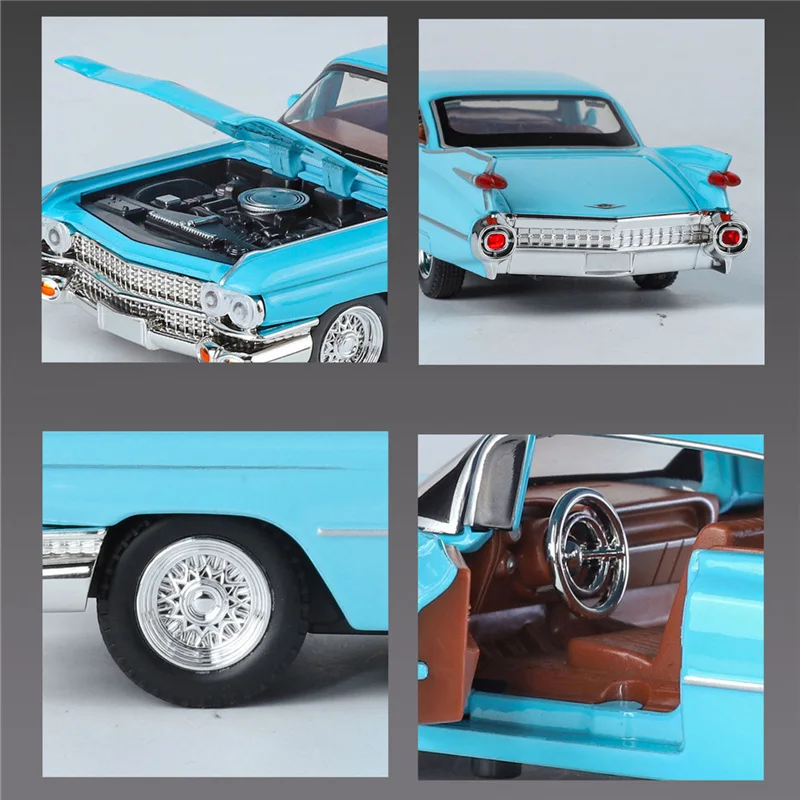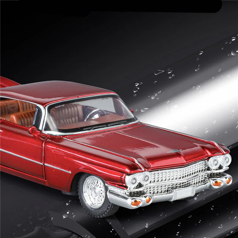 This exquisite 1/32 scale model of a 1959 Cadillac Eldorado Biarritz, crafted by MAKEDA, captures the essence of vintage luxury with its striking burgundy paint and glossy finish. The meticulously detailed exterior features iconic tail fins, chrome accents around the grille, and rounded headlights that evoke nostalgia. Inside, the tan upholstery replicates classic leather interiors, while the chrome-spoked wheels add an elegant touch. Placed against a textured surface, this diecast metal model is perfect for display and showcases exceptional craftsmanship. Ideal for collectors, it’s a timeless piece that transports you back to the golden era of automotive design.