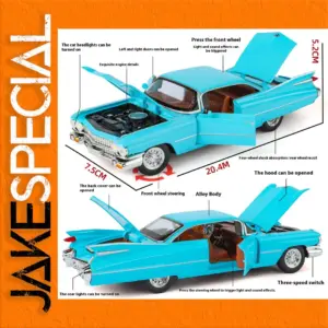 Experience the allure of classic automobiles with this eye-catching 1959 Cadillac Eldorado Metal Die Cast Retro Car Model. Crafted in a vibrant sky blue, this detailed 1/24 scale model features operable doors and hood, revealing an intricately designed engine compartment. The elegant brown interior is visible through clear windows, enhancing authenticity. Functional front wheels permit steering, while the model offers engaging sound and light effects activated by pressing the front wheel, making it a delightful collectible. Perfect for display or as a gift, this model encapsulates the retro charm of one of the most iconic cars in history.