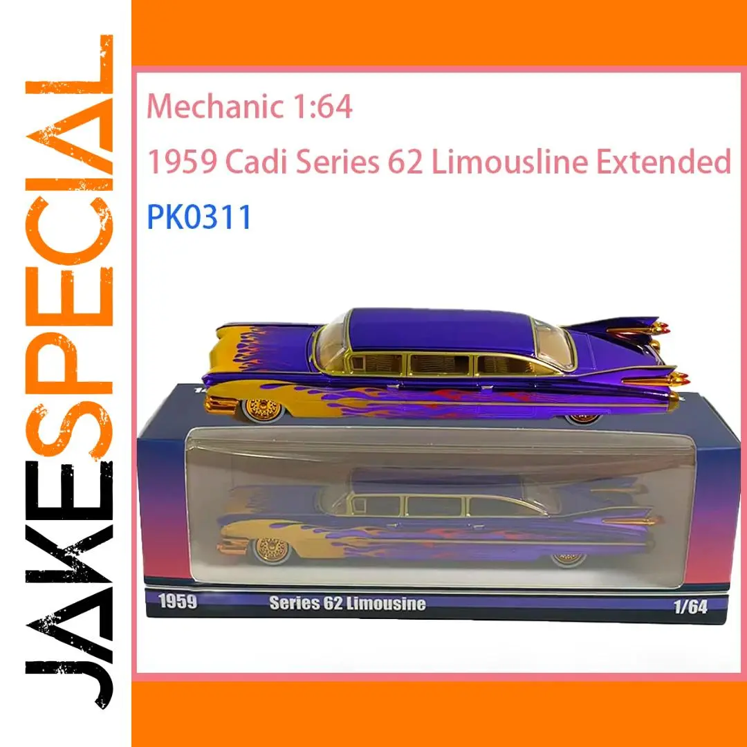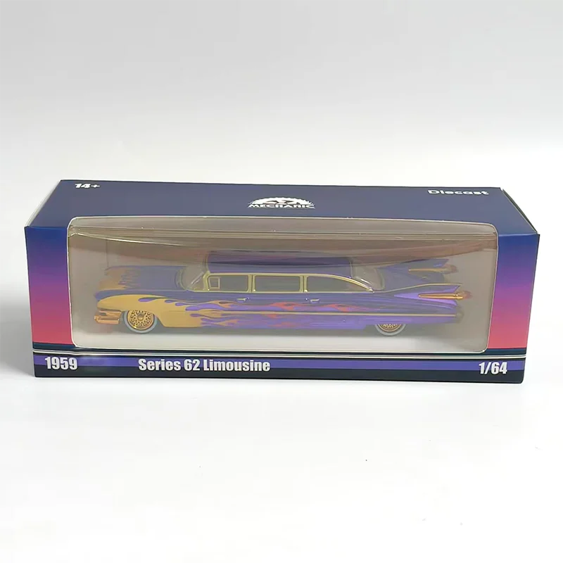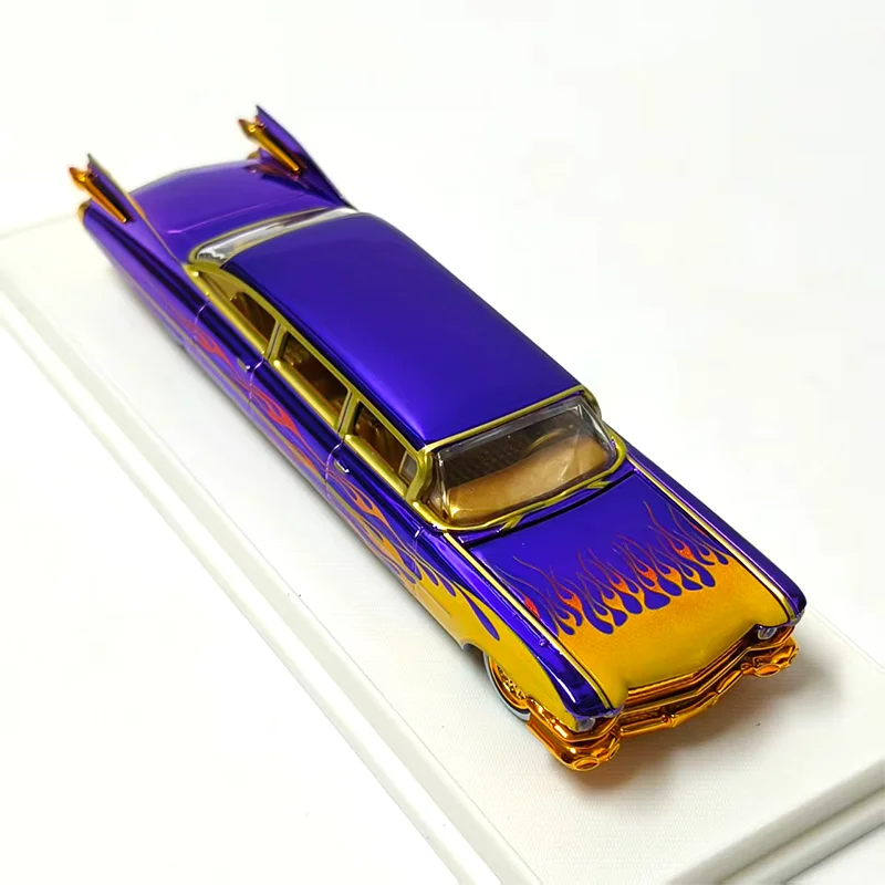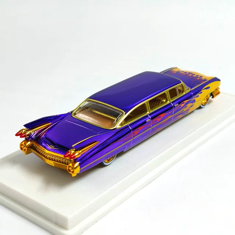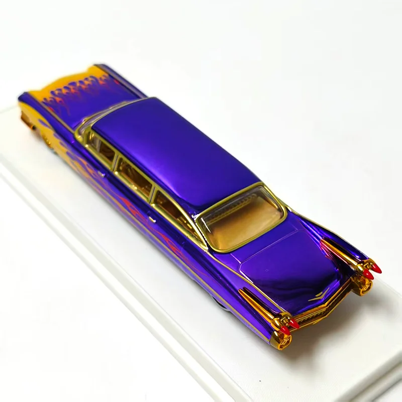Discover the timeless elegance of this highly detailed diecast alloy model of the iconic 1959 Cadillac Series 62 Limousine. Crafted at a 1/64 scale, this special version captures the elongated, luxurious silhouette characteristic of vintage Cadillac limousines. The vibrant purple paint job is complemented by shimmering gold trim and flowing flames from the front fenders, creating a bold and eye-catching aesthetic. The polished surface mimics chrome and glossy paint, enhancing its premium appeal. Features include a detailed front grille, delicate tail fins with pointed tail light accents, and gold-colored rims that reflect real vintage hubcaps. Perfect for collectors, enthusiasts, or stylish decor, this model adds a nostalgic touch of retro glamour to any space.