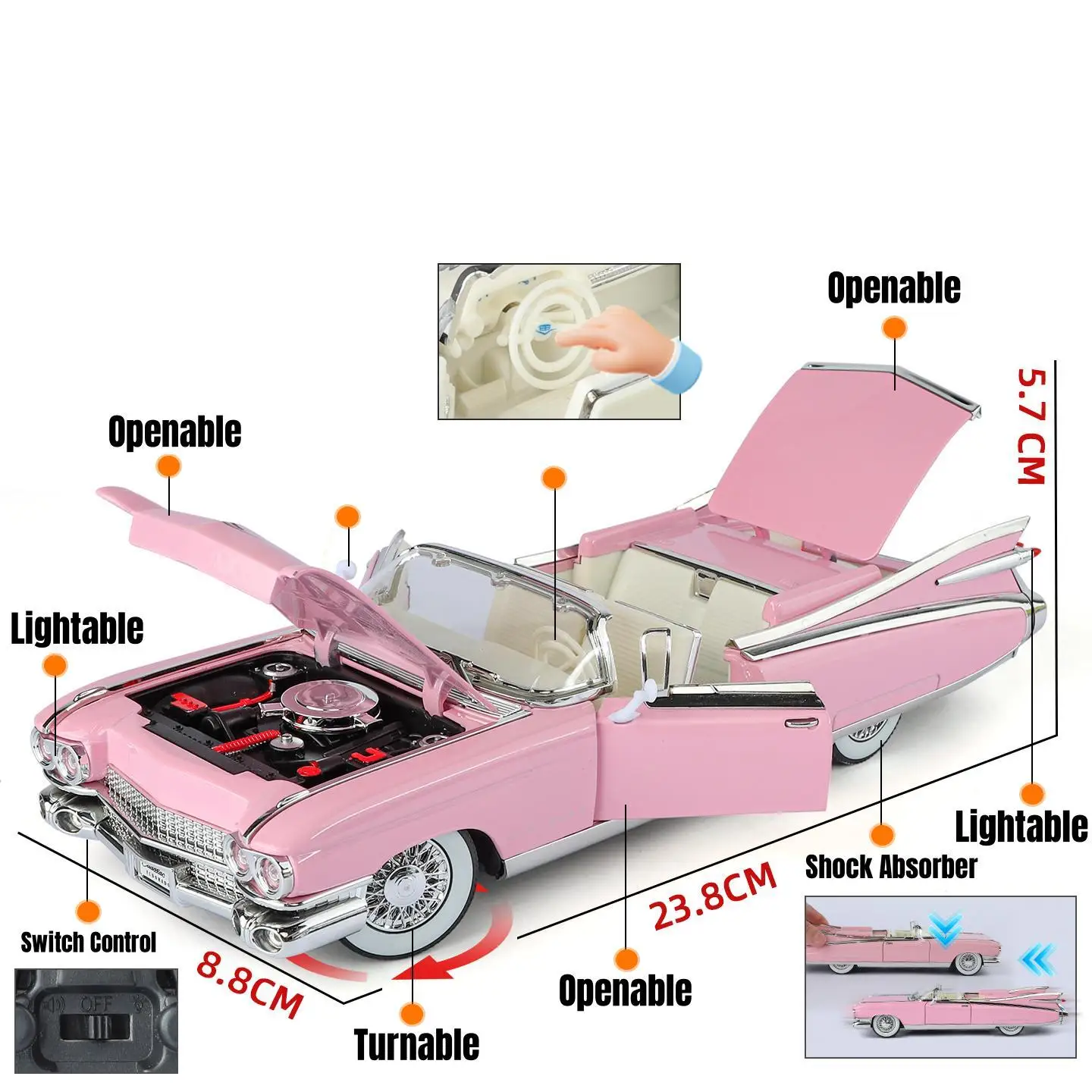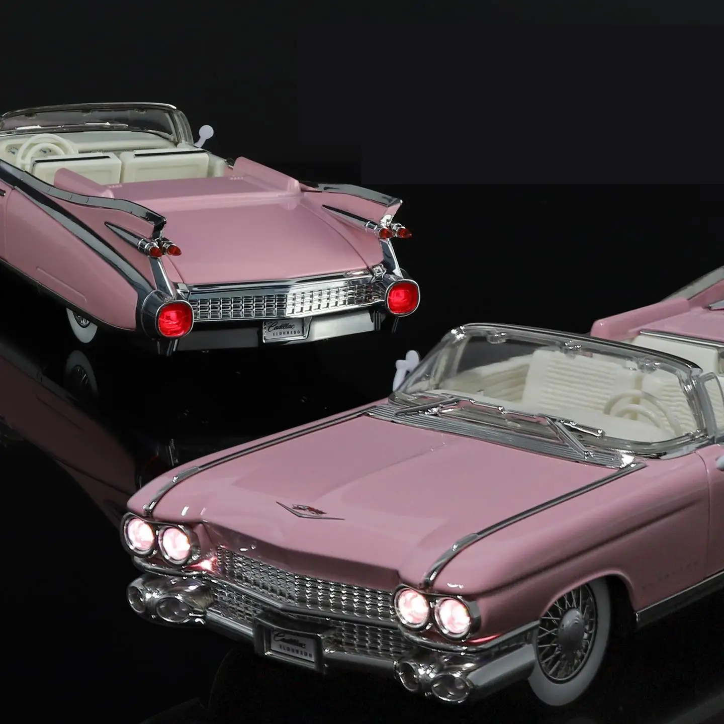 Imagine owning this eye-catching 1959 Cadillac Eldorado miniature model, beautifully finished in a glossy, vibrant pink that truly captures the vintage elegance of the classic car. Its flowing body lines, sharp tail fins, and intricate chrome accents make it a standout display piece. The detailed craftsmanship brings to life the iconic design features, including the chrome grille, round headlights with bezels, and white-wall tires with wire-style chrome hubcaps. Functional light and sound features add an interactive, realistic touch, making it perfect for collectors and enthusiasts alike. Whether displayed on your shelf or used as a nostalgic conversation starter, this miniature merges vintage charm with modern craftsmanship for a captivating aesthetic experience.