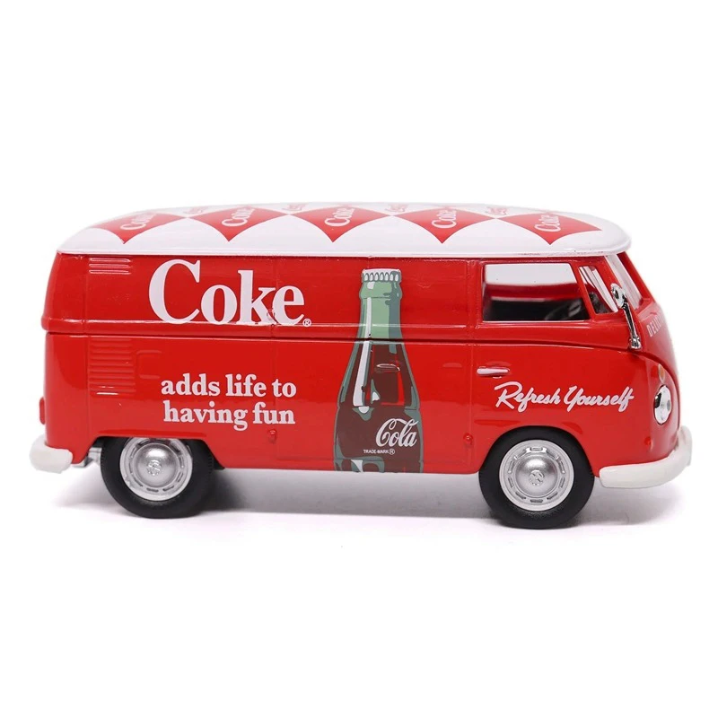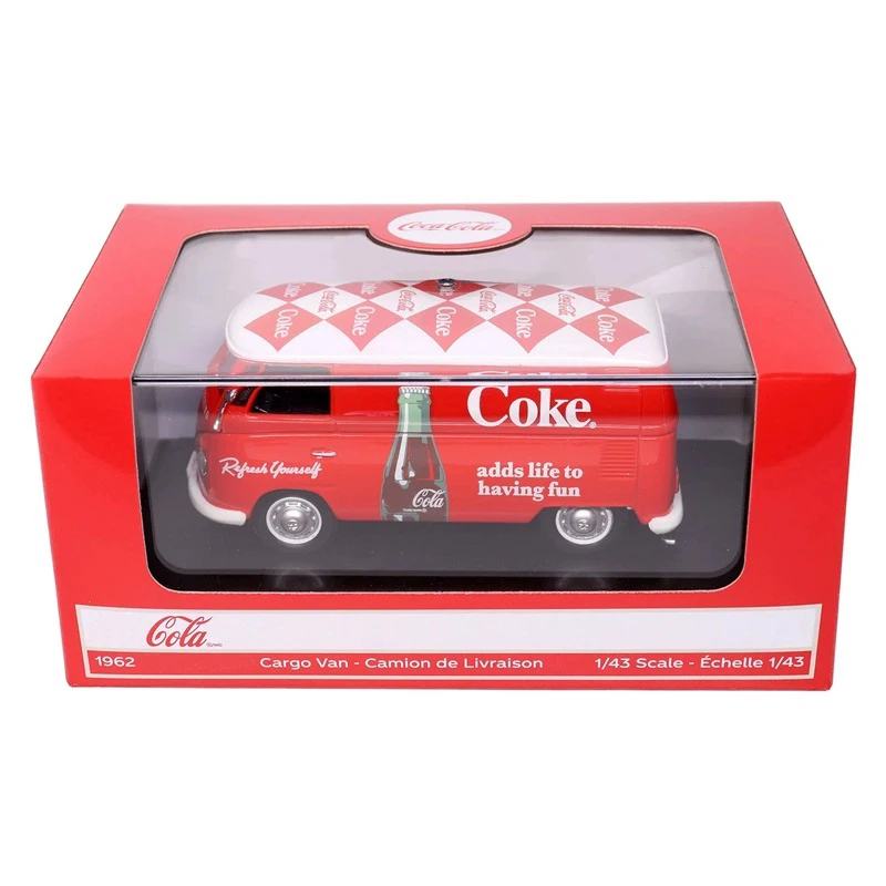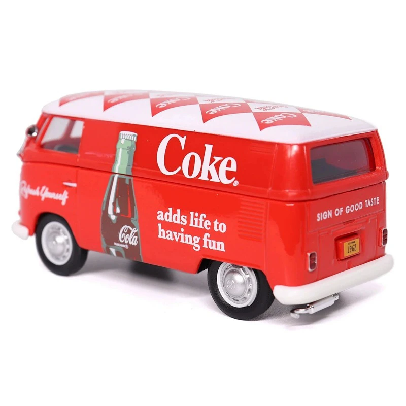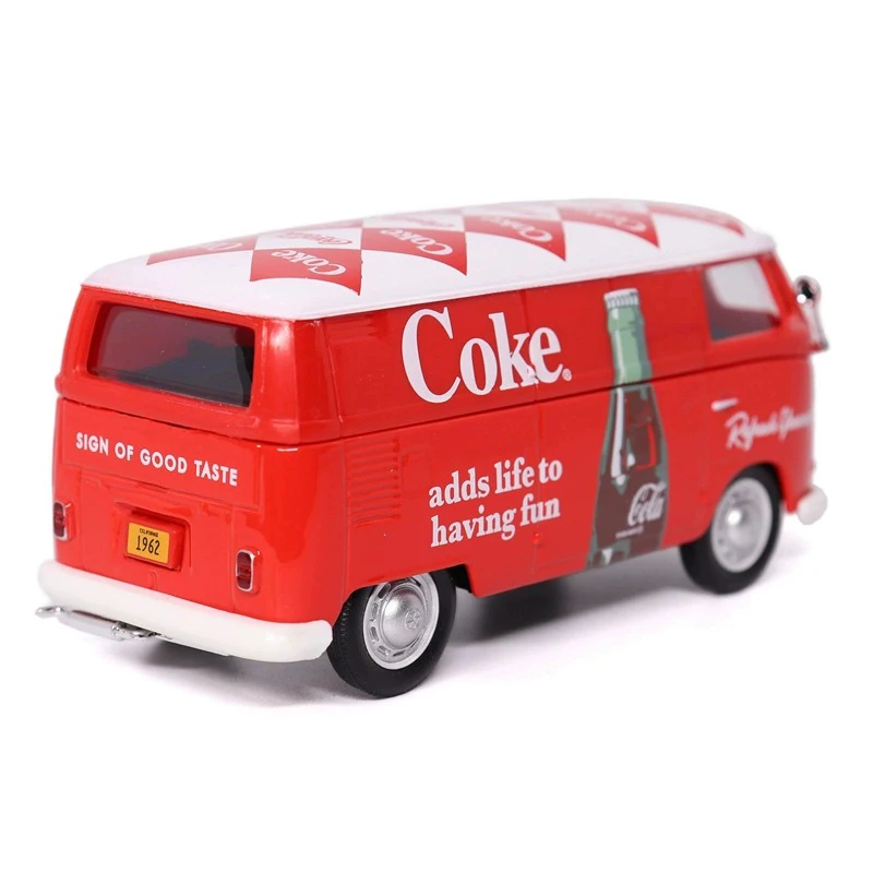 - This diecast model accurately captures the vintage 1962 Coca-Cola cargo van, with detailed exterior features including a red paint finish and endearing white diamond pattern roof design.