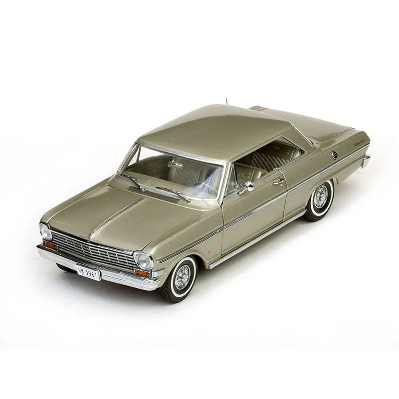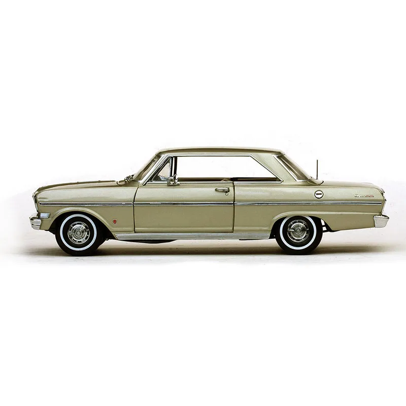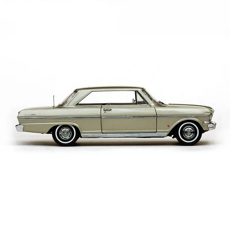 Imagine showcasing this beautiful 1963 Nova diecast model, finished in a luxurious metallic beige or champagne hue. Its meticulously crafted, vintage-inspired design captures the essence of mid-20th-century American automobiles. The glossy surface accentuates the car's angular profile, with detailed trim lines along the sides, a flat hood with a subtle central crease, and a wide horizontal grille flanked by round headlamps. Realistic black tires with chrome hubcaps sit within rounded wheel arches, completing its authentic appearance. The clear windows and smoothly integrated door handles enhance its polished, collector-quality finish. Perfect for display, this model brings a nostalgic charm to any collection or decor, adding a refined vintage touch to your space.