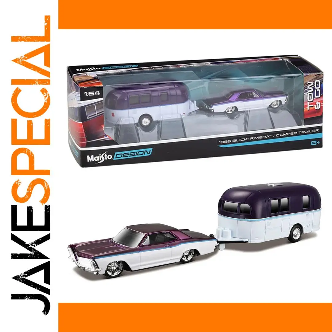Experience the charm of the 1960s with this meticulously crafted diecast model set inspired by the classic 1965 Buick Riviera. Featuring a sleek, elongated body with a glossy white finish and vibrant metallic purple accents on the roof and hood, this model exudes vintage elegance. The clear plastic windows and chrome details on the grille and rims add a realistic touch, making it a perfect collectible piece. The attached camper trailer has a streamlined, rounded shape, primarily white with a dark purple upper curve, textured to mimic paneling and vents. Its compact size and detailed features make it a striking display item for fans of retro automobiles and nostalgic design. Set your collection apart with this authentic vintage replica.