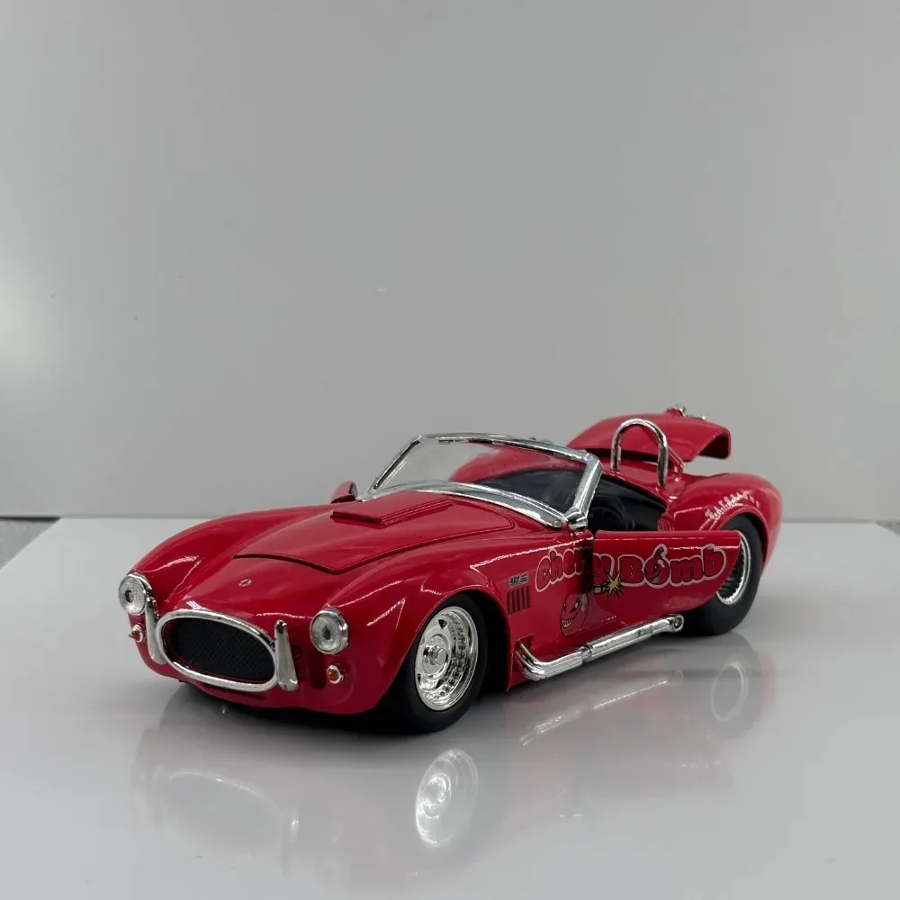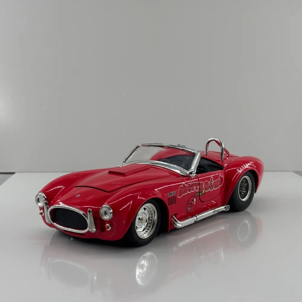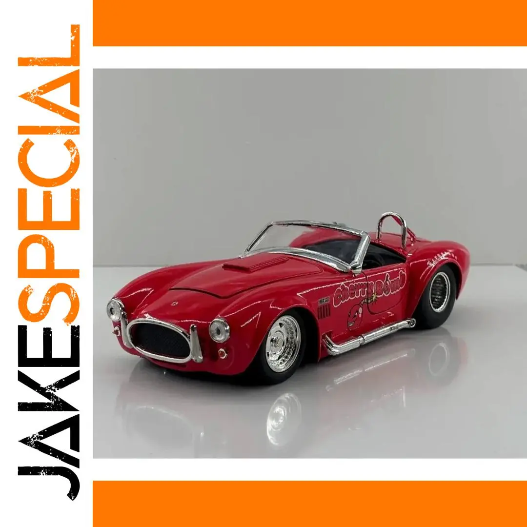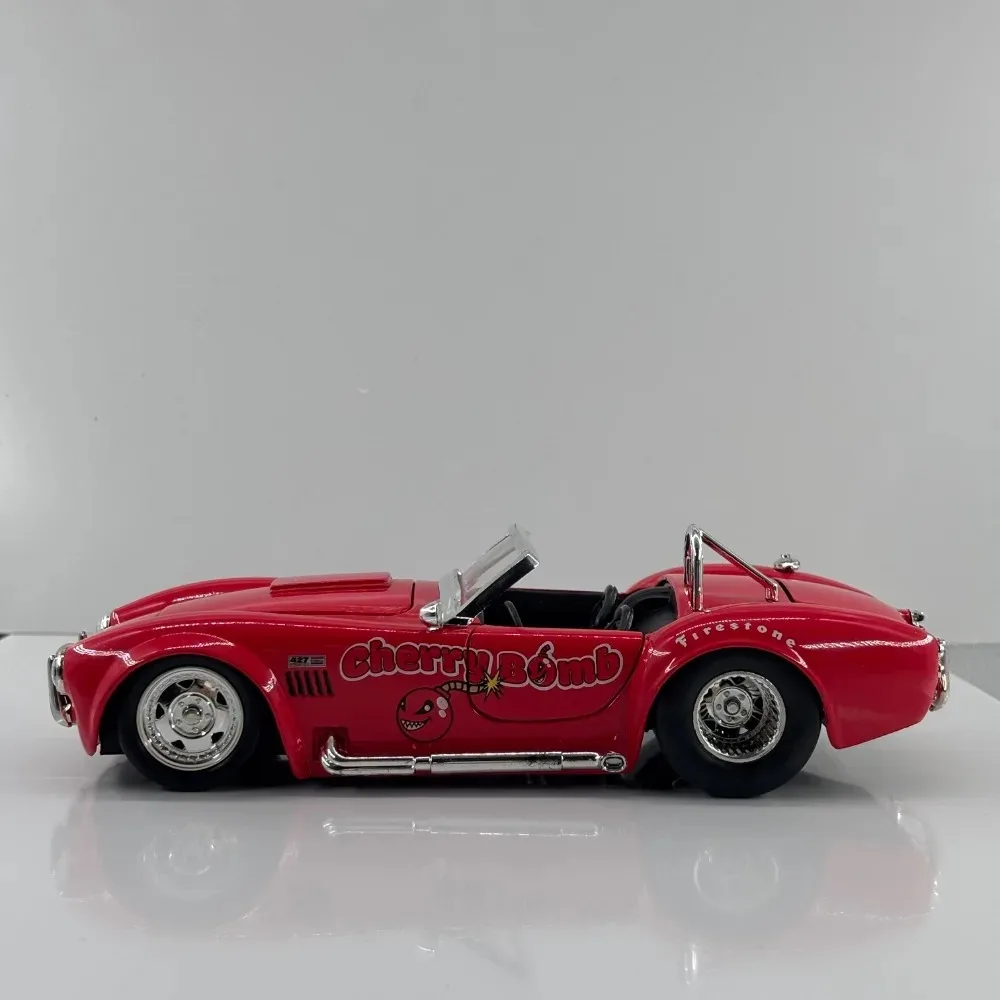 Immerse yourself in the vintage racing spirit with this detailed diecast model of the 1965 Ford Shelby Cobra 427SC. Finished in a striking glossy red, this miniature captures the sleek, aerodynamic lines and muscular stance of the iconic sports car. Its meticulously crafted chrome accents on the grille, headlights, side mirrors, and exhaust pipe highlight the model’s high-quality diecast construction. The shiny multi-spoke rims complement textured black tires with realistic tread patterns, adding to its authentic appeal. Playful “Cherry Bomb” graphics near the doors give a lively character to the model. Perfect for display, this collectible will add a touch of vintage racing charm to any collection or space.