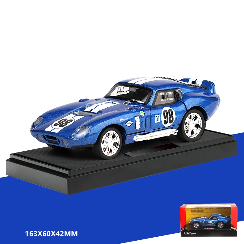 Immerse yourself in the craftsmanship of this meticulously crafted 1:32 scale diecast model of the iconic 1965 Ford Shelby Cobra Daytona Coupe. Showcasing a vibrant metallic blue finish with a shimmering glitter effect, this model captures the exhilarating spirit of vintage race cars. Its sleek, aerodynamic silhouette features smooth curves, a low profile, and fine details like racing decals, vent lines, and a contrasting white racing stripe along the roof. The silver alloy wheels with detailed rims and the clear plastic canopy offer a realistic and eye-catching appearance. Perfect for collectors and automotive enthusiasts, this model makes an impressive decorative piece and a tangible connection to racing history.
