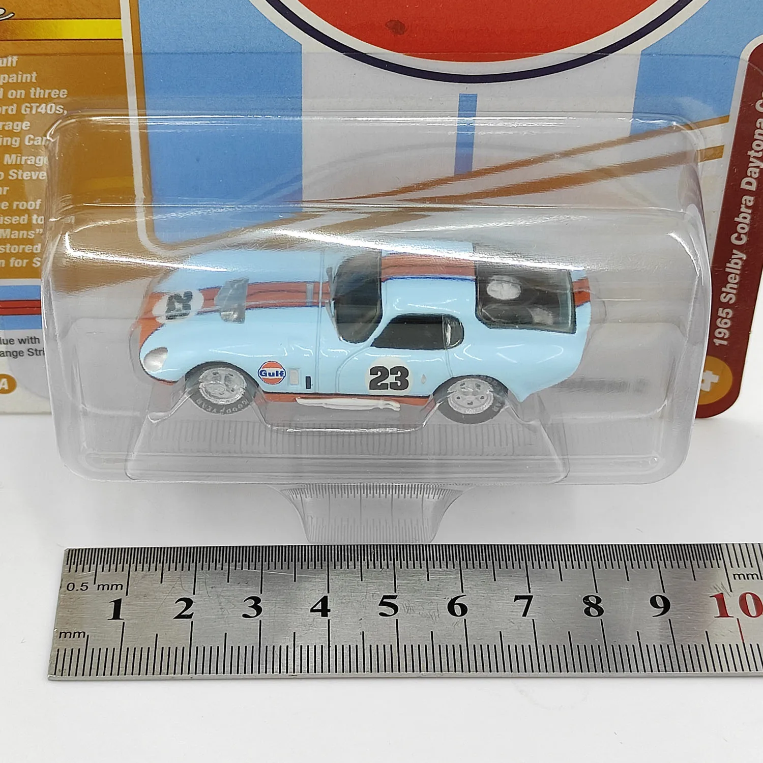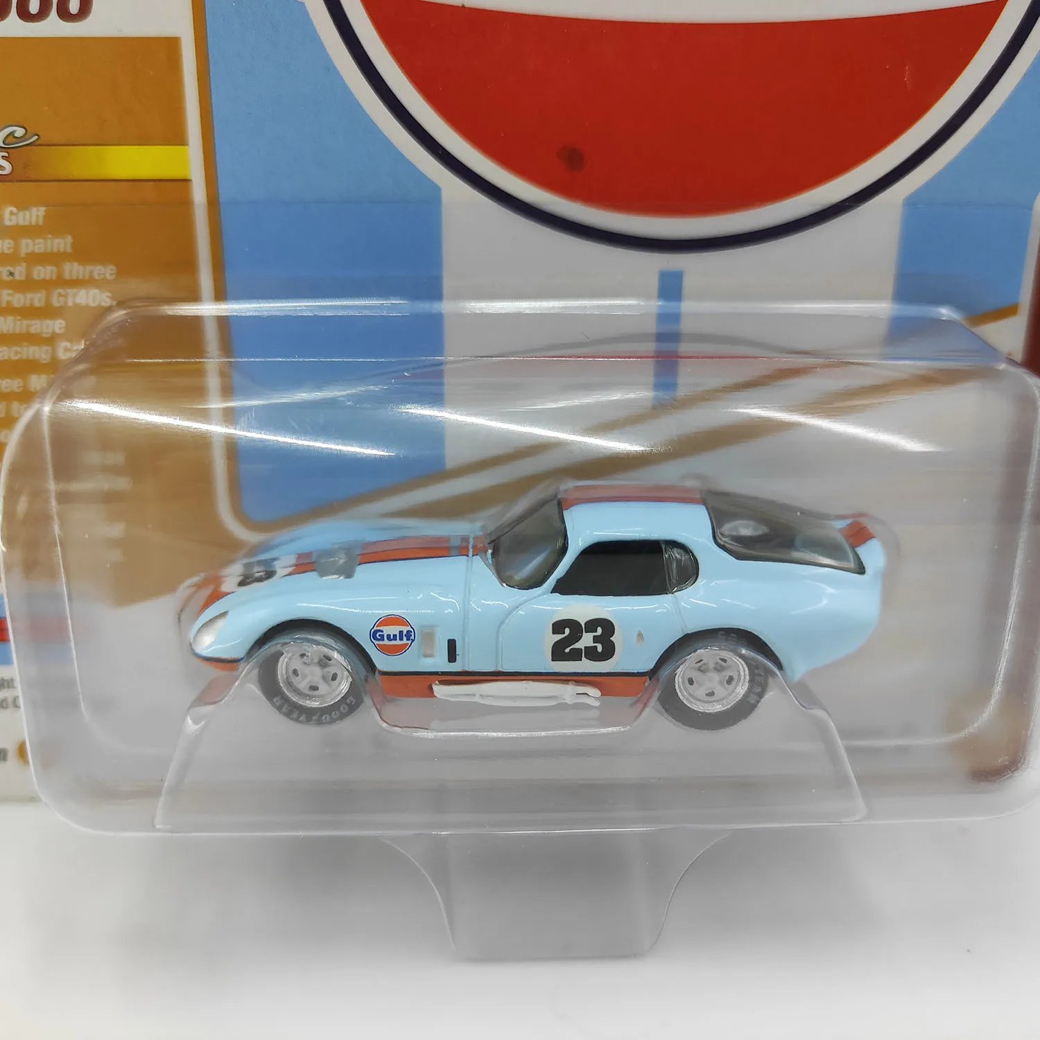 Experience the thrill of vintage motorsport with this meticulously crafted 1:64 scale diecast model of the iconic 1965 Shelby Daytona. Designed for collectors and enthusiasts, this model captures the sleek, aerodynamic profile characteristic of classic race cars. The light blue body is accented with vibrant Gulf Oil racing livery—an orange stripe running along the lower side, a white stripe above, and prominent Gulf logos on the doors—creating a visually striking display piece. The glossy finish enhances the detailed craftsmanship, including silver rims and tinted black windows that add realism. Perfect for display on shelves or desks, this model embodies nostalgic racing history and style, making it an ideal addition to any collection of automotive memorabilia.