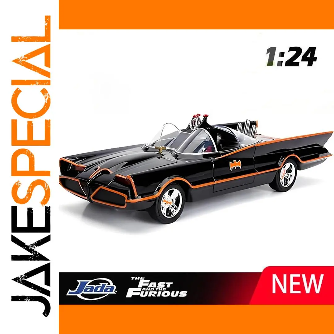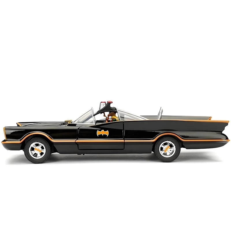 Indulge your passion for iconic vehicles with this 1:24 scale model of the 1966 Batmobile. This exquisite diecast model boasts a sleek black body accented by vibrant orange details, perfectly capturing the legendary design. Its pointed front, signature tail fins, and elongated shape effortlessly transport you back to the era of classic superheroes. Made from a durable combination of alloy and plastic, this model reflects high-quality craftsmanship. Featuring shiny chrome-like wheels and an intricately designed interior visible through a transparent canopy, it’s a must-have for collectors and fans alike. This Batmobile model is intended for display, allowing you to proudly showcase it in your collection.