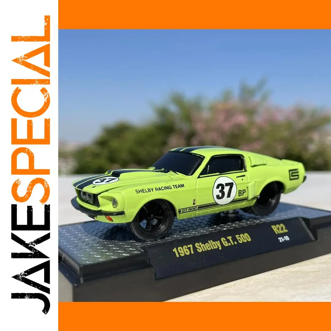Experience the thrill of owning a detailed replica of the iconic 1967 Shelby G.T. 500 with this 1:64 scale diecast model. Expertly crafted from metal, this collectible captures the classic racing spirit, featuring vibrant lime green paint accented by bold black racing stripes. The black stripe on the hood extends from the grille to the windshield, with a prominent white decal bearing the number “37.” The sides proudly display large circular decals with “37” and “BP,” along with the “SHELBY RACING TEAM” lettering. Its sleek aerodynamic design includes realistic features such as the front grille, fixed headlights, side vents, and an integrated rear spoiler. Perfect for display, it’s a stunning tribute to vintage racing automotive craftsmanship.