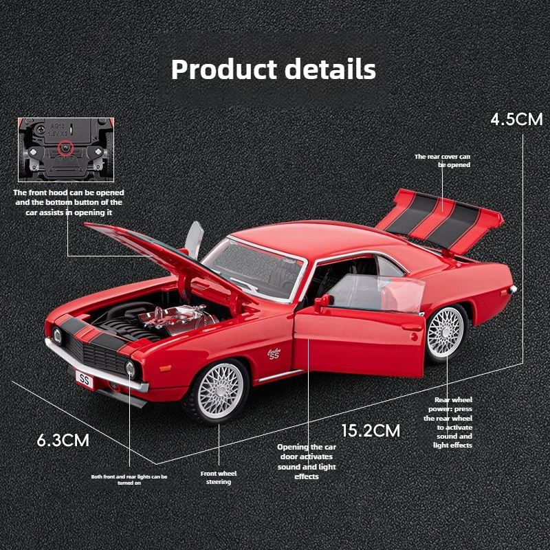 Now is the perfect time to elevate your collection with this stunning replica. Whether as a gift or a personal display piece, this detailed Camaro SS captures the essence of the iconic muscle car era. Its realistic craftsmanship, combined with interactive sound and lighting effects, makes it a true centerpiece. Imagine the pride of showcasing this model on your shelf or gifting it to a fellow enthusiast who appreciates vintage automotive history. Don't miss out—own this meticulously crafted 1969 Camaro SS today and experience a piece of classic muscle car nostalgia in your own space.