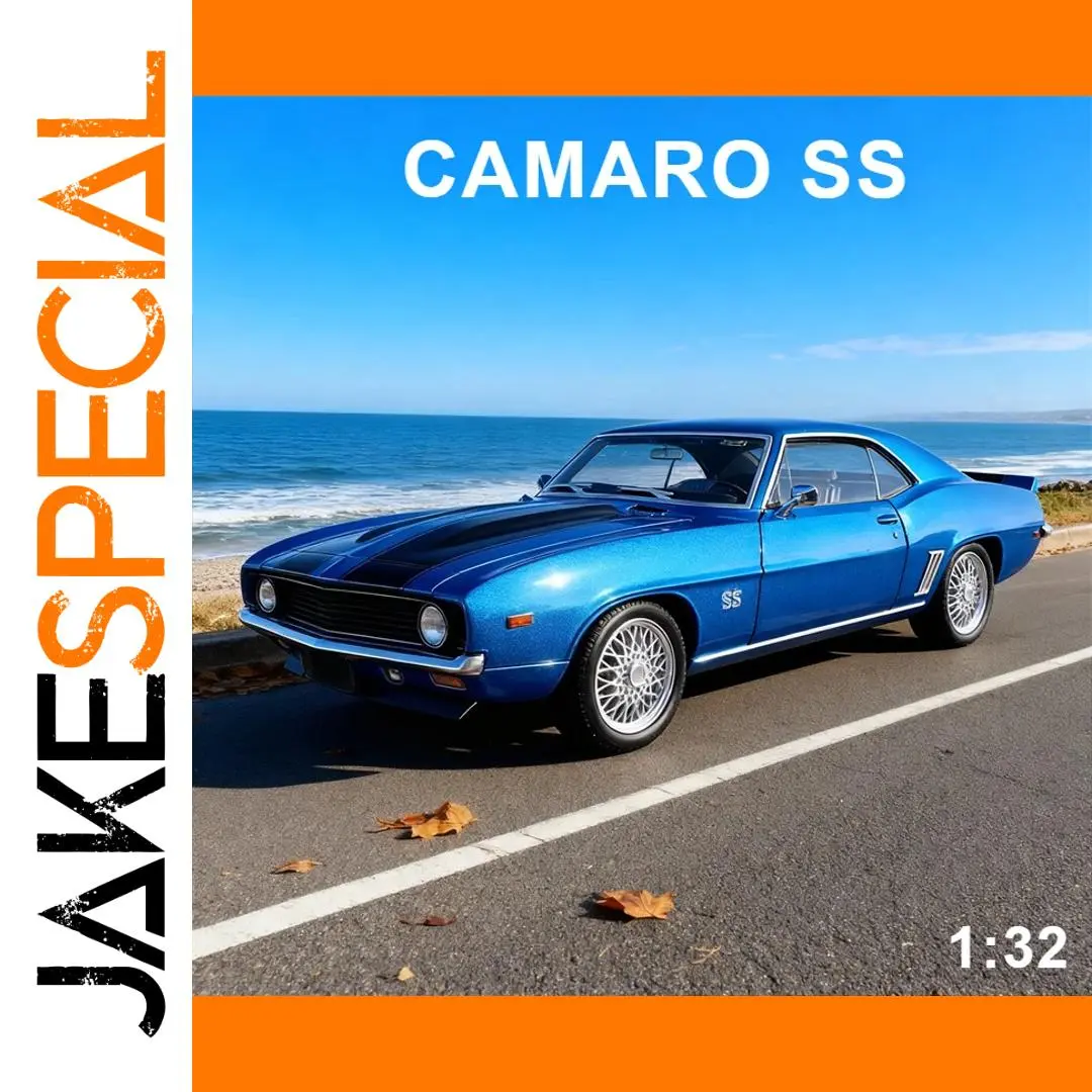 Immerse yourself in the timeless allure of the iconic 1969 Chevrolet Camaro SS with this meticulously crafted 1:32 scale diecast model. Featuring a vibrant metallic blue finish, it captures the sleek, aerodynamic silhouette of the classic muscle car. The detailed exterior includes black racing stripes, round headlights integrated into a black grille, chrome accents, and small metallic side mirrors, highlighting its authentic design. Equipped with sound and light functions, and a pull-back mechanism, this model offers an engaging experience. Made from durable metal alloy and certified free of harmful chemicals, it’s perfect for collectors and enthusiasts. Whether displayed or played with, this replica will elevate any collection with its impressive realism and stylish presence.